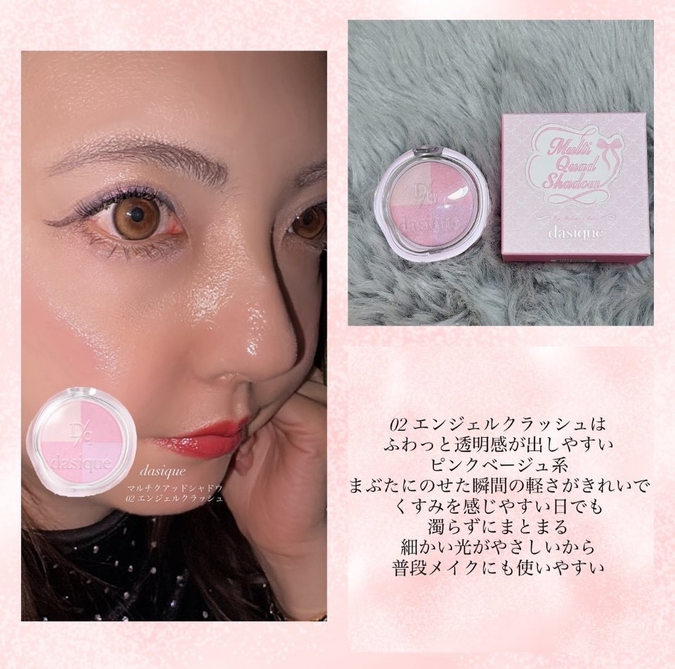 .・──*──୨୧──*──・\メガ割で絶対ゲットして/dasiqueバレエコアコレクションから4色パレットが登場したよ💗ベースからソフトな陰影カラーまで4色の組み合わせでロマンチックな雰囲気を演出してくれるんだ♩私が使用したのはブルベさんに...