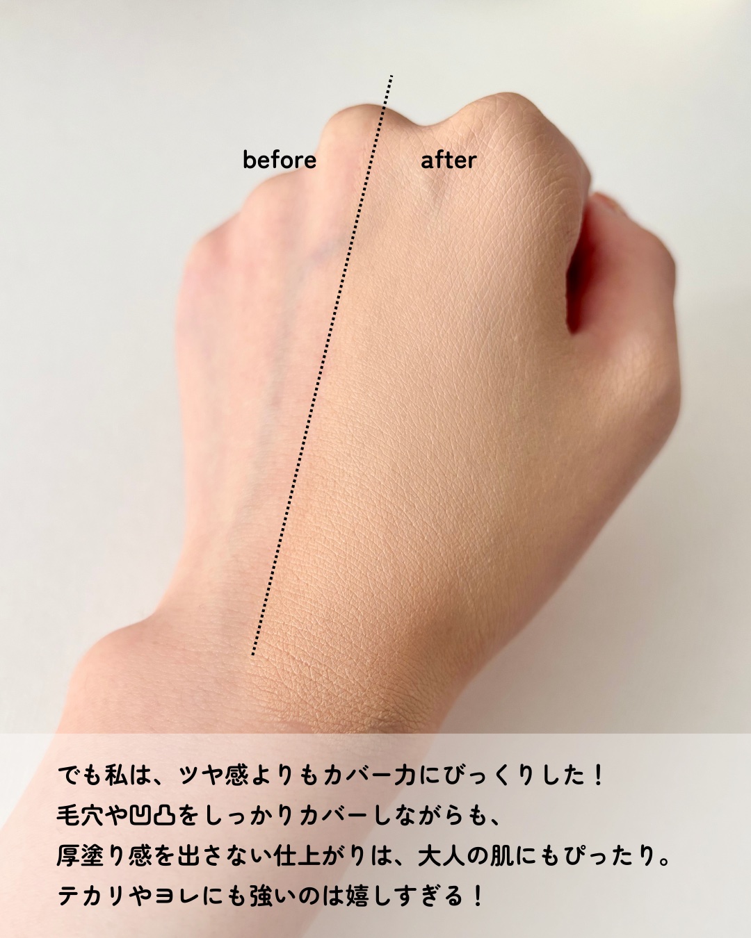 毛穴はカバーされてるのに肌色補正がとても自然でとても好き! 紫外線防止効果もSPF50+・PA++++。そしてきしみにくい! どんどん使っていくぞー! 大事に使います!ありがとうございます!