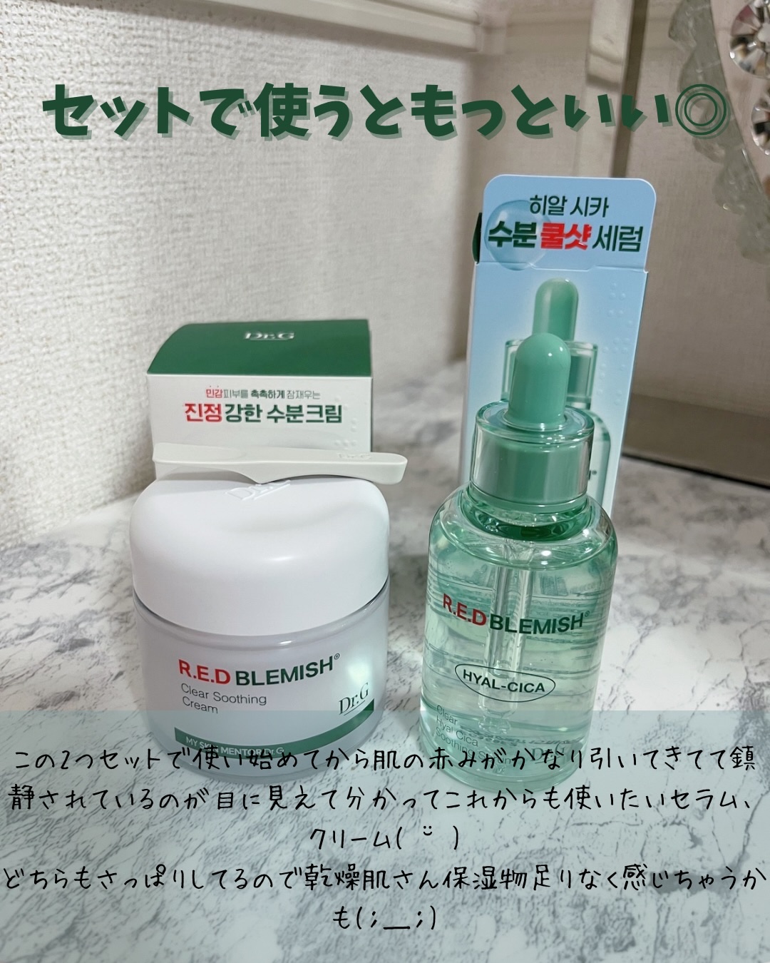 #PRDr.G様より頂きました✨«肌温度を下げてメイクのりup⤴️»💚レッドブレミッシュヒアルシカ水分セラム❤️レッドブレミッシュクリアスージングクリーム💚レッドブレミッシュヒアルシカ水分セラム透明で少しとろみのあるテクスチャーみずみずしくの...