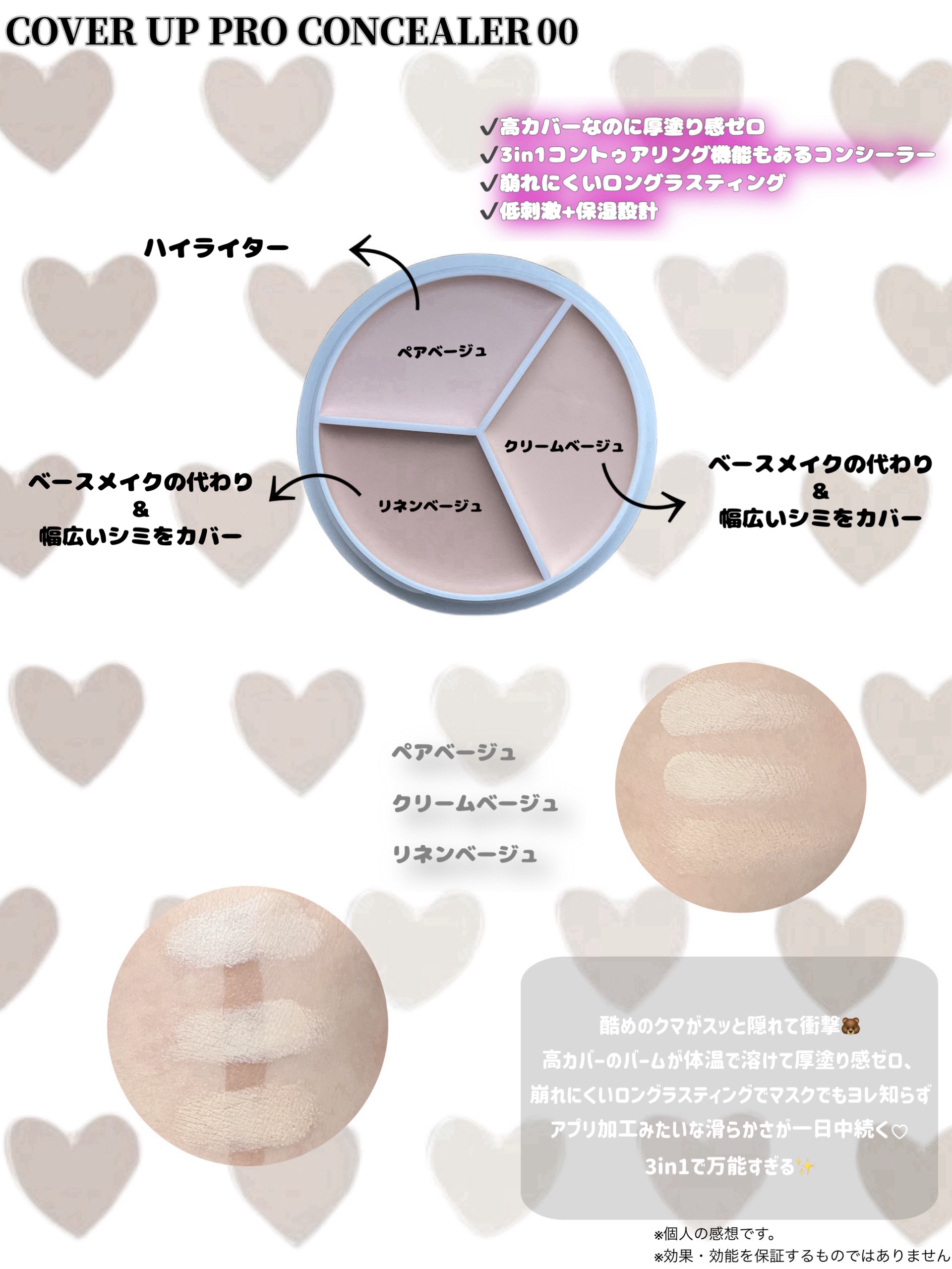 高いカバー力と密着力、綺麗な仕上がりが続くのが特徴的です。3つのカラーがセットになっているから、ハイライトやシェーディングとして、またカラーミックスして使うことも可能です。 なめらかな塗り心地で厚塗り感なく、ピタッと密着してくれるので崩れにくさを感じました。特に青クマには悩まされているので、サーモンピンクの色味が活躍中です。 パステルカラーも可愛くて気分もあがります。 Qoo10やAmazon、ロフトやPLAZAなどでも販売されているのでぜひチェックしてみてください😉