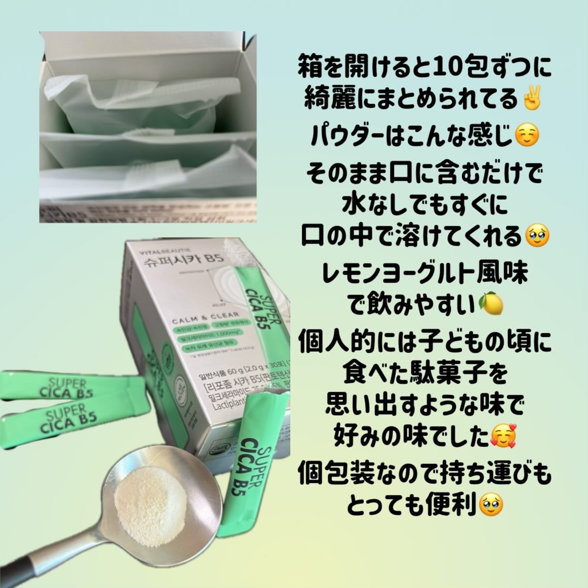 バイタルビューティー スーパーシカB5✔️ミルクセラミド・ビタミンB5・シカコンプレックスを配合し、敏感な肌を内側から落ち着かせ、うるおいを与えるインナービューティーパウダーです。✔️スティックタイプのパウダー形状で手軽に摂取でき、続けやすく...