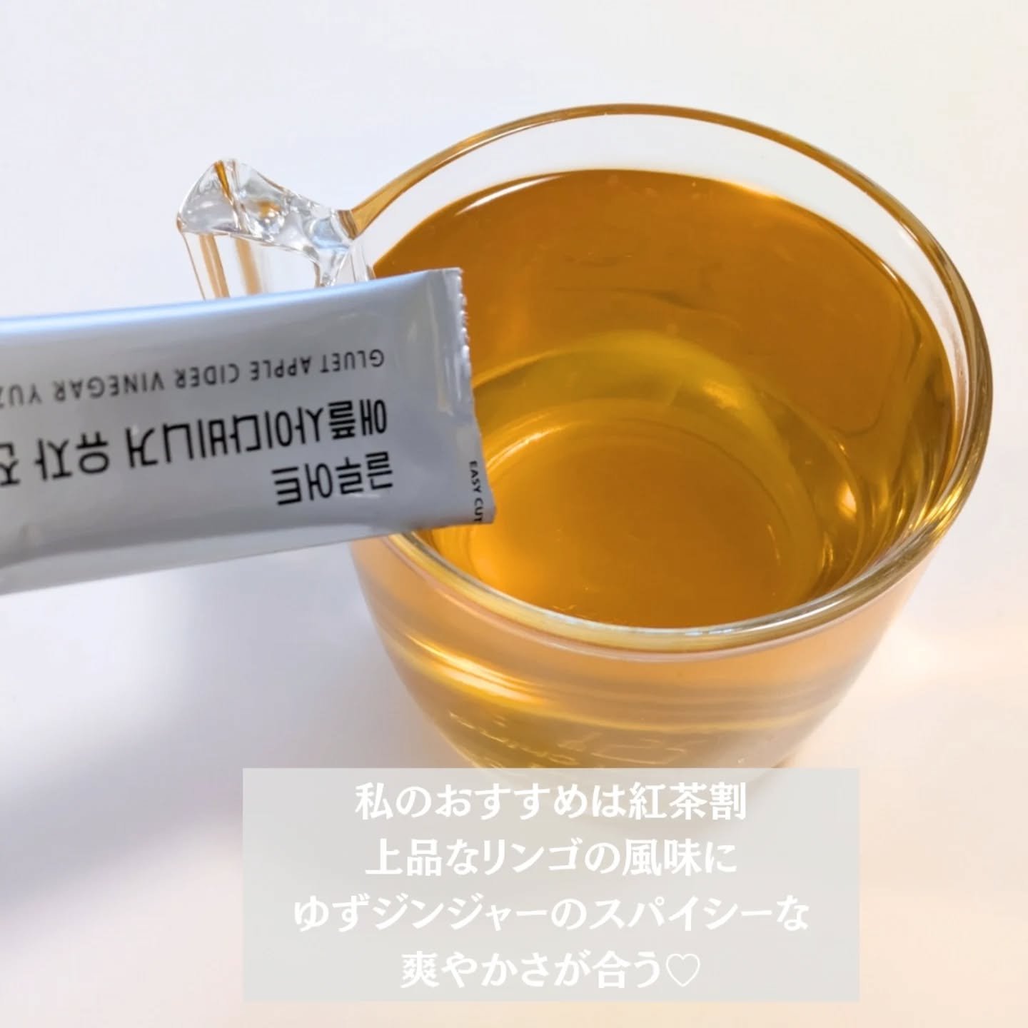 Gluetアップルサイダービネガーゆずジンジャー試してみたよ。アップルサイダービネガー(アサビ)のインナーケア。個包装で15本入り。水や炭酸水に混ぜて飲むと飲みやすい。まろやかなお酢で、ほんのり柚子の香りが美味しい。ジュースやエイド、柚子ジン...