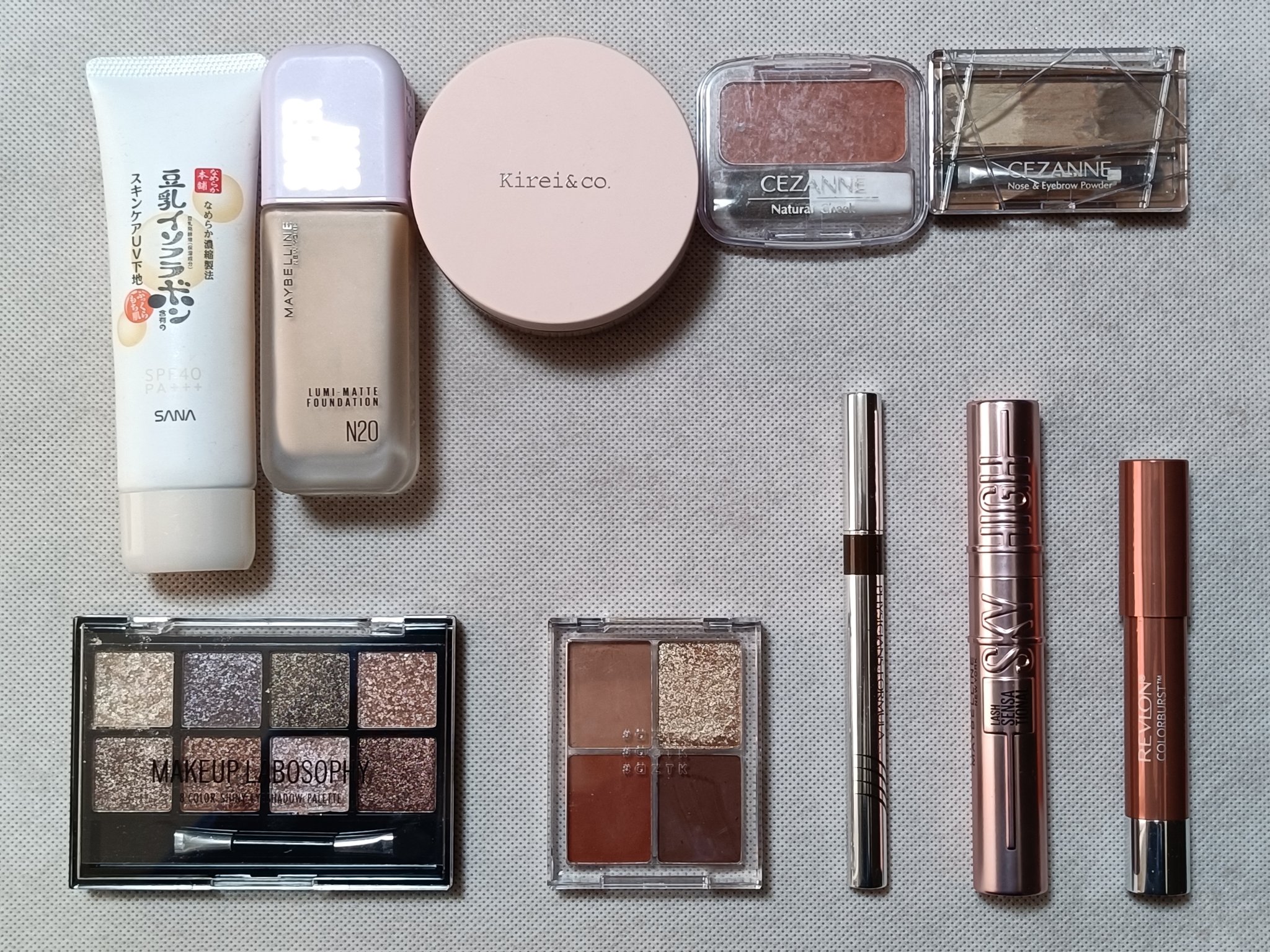 アリィー ニュアンスチェンジUV ジェル RSを、顔全体にまんべんなく塗ります。 RMK RMK ジェルクリーミィファンデーション 103を、顔全体にまんべんなく塗ります。 ジョンソンベビー ジョンソン ベビーパウダーを、顔全体にまんべんなく軽くはたきます。 THE BODY SHOP bronze shade warm glowを、両頬に塗ります。 KATE リフレクトミラーアイズ BR-1の締め色を、眉毛全体にまんべんなく塗ります。 URGLAM UR GLAMBLOOMING EYE COLOR PALETTE 01を、使用しました。 ちふれ リキッド アイライナー 筆ペンタイプ BK30 ブラックを、塗ります。 CEZANNE エアリーカールマスカラを、まつ毛全体にまんべんなく塗ります。 MAYBELLINE NEW YORK コロッサルボリュームエクスプレスを、まつ毛全体にまんべんなく塗ります。 MAYBELLINE NEW YORK SPステイ マットインク 135を、唇全体にまんべんなく塗ります。