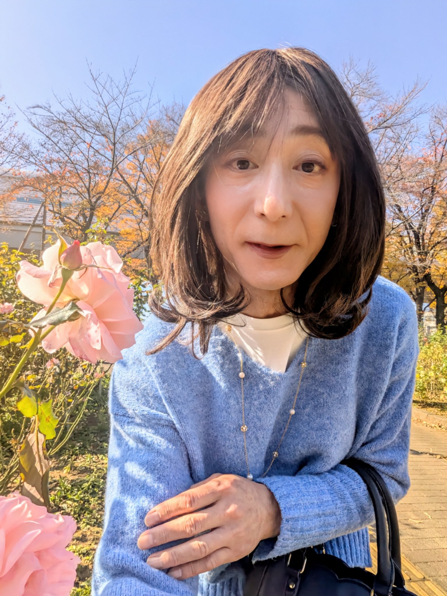 水色のニット似合ってる! ひろみさんの柔らかい表情とマッチしてて、思わず私も水色のニットが欲しくなった〜🩵