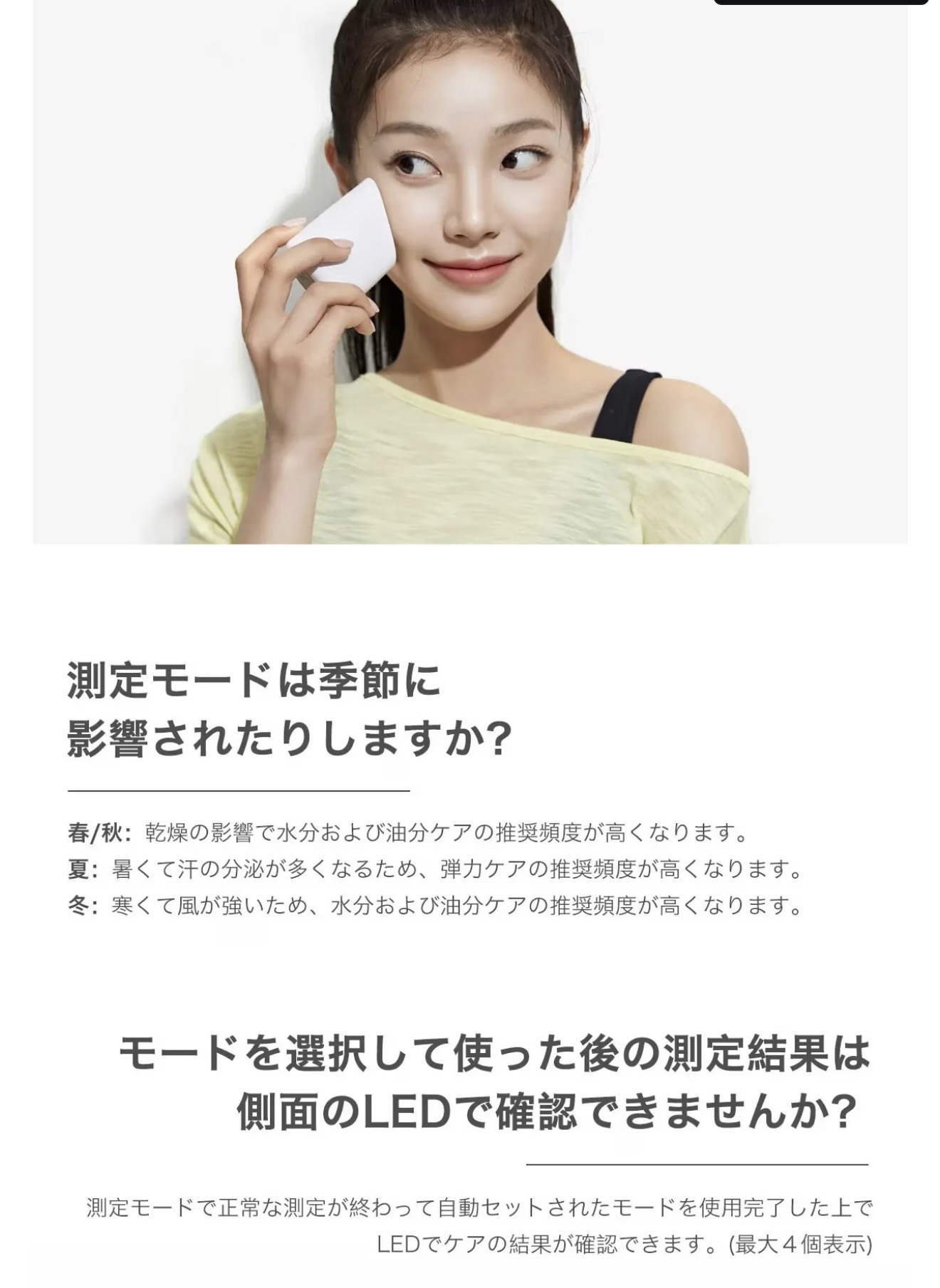 - 3秒診断・3分ケア、習慣的ビューティーセラピー。 肌診断で肌が求めるソリューションを探し 微細電流とLEDのシナジーケアで『水分』『ツヤ』『弾力』をチャージ。