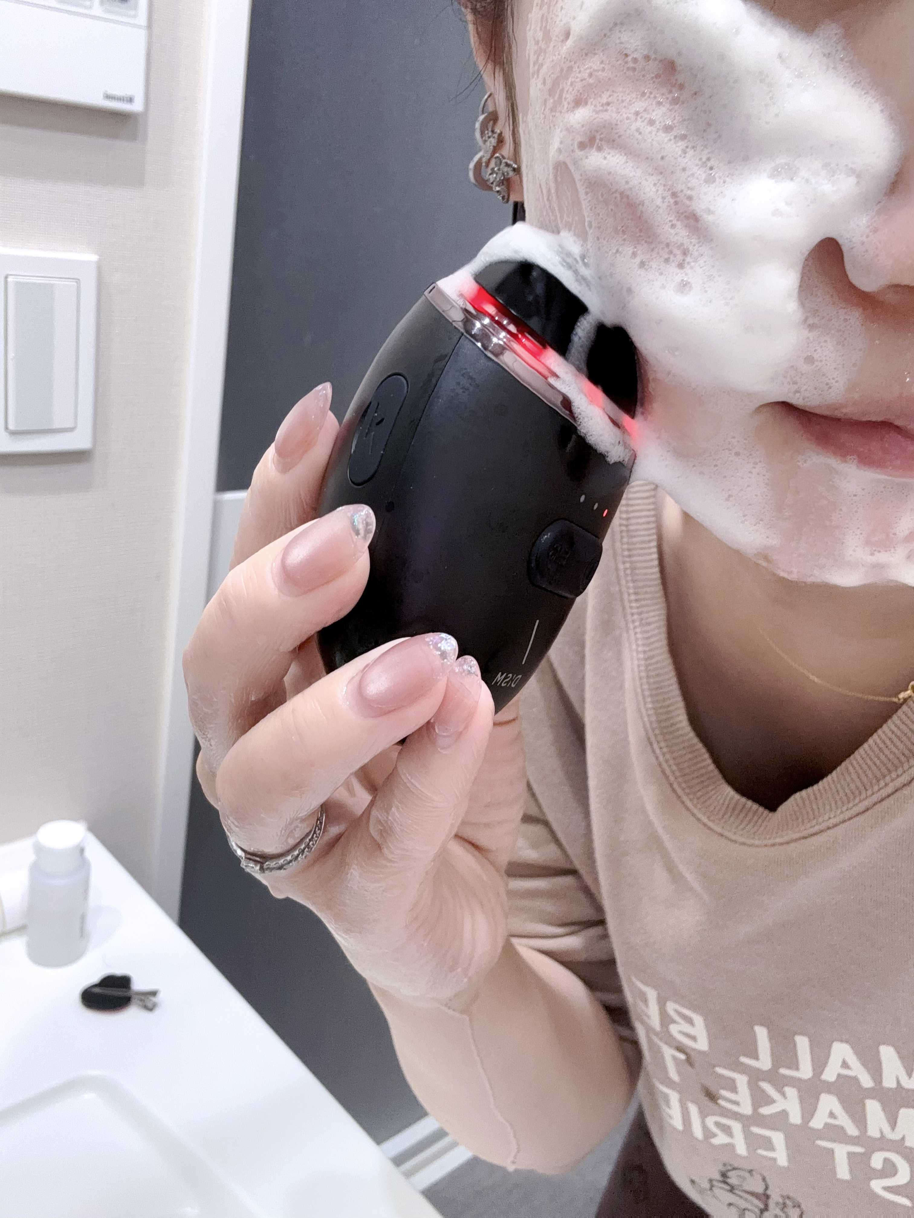 - STEP1.EMSクレンジングリフト※2モード 本モードは、直径0.7mmの極細毛と、毎分約11,000回の音波振動によって、手洗顔では落としきれない皮脂や角栓などの汚れを擦らず優しく浮かせ、毛穴汚れをスッキリ除去します。また、EMSで表情筋を刺激することで、フェイスラインやたるみ毛穴を引き上げ※2ます。 ✔ クレンジングのポイント ①音波振動で擦らず汚れを除去 毎分約11,000回の音波振動が汚れを擦らず優しく浮かせます。また角質層の約1/4ほどの薄さといわれる卵黄膜も破れないほどの優しい刺激です。 ②日本初※1の可動式ヘッド 細かな箇所にも左右にフィットする可動式ヘッドで、当てづらい小鼻やフェイスラインなどの曲線に対してもぴったりフィットします。 ③特許構造の独立型コア 振動部が本体中心部ではなく独立ヘッド部にあるため、振動の力が分散されず、ダイレクトに伝わります。 ✔ リフトケアのポイント ①360本の導電性 シリコンブラシ 直径わずか0.7mmの極細毛で、撫でるような洗顔をサポート。柔軟性があり、顔の凹凸にフィットしやすいため、電流を効率的に肌に伝えます。密着度が高く、EMSの効果を引き出せます。 ②EMSで顔を引き上げ※2ながら毛穴のエイジングケア※4 洗顔時に滑らかな肌触りで毎日使いやすいEMSを採用。 刺激が苦手な人も使いやすいよう、弱、中、強のレベルを設定し使用することが可能です。 電気刺激によりフェイスラインを引き上げ※2ながら、開いたたるみ毛穴のエイジングケア※4も叶えます。 STEP2.イオン導出ディープ※3クレンジングモード 週1~2回のイオン導出で、自宅でディープクレンジングができる機能です。プラスイオンの力で、マイナスに帯電している毛穴の奥に蓄積した皮脂や汚れを吸着。感覚振動の軽いタッチで毛穴の汚れを浮かして落とします。 STEP3.イオン導入※3モイストモード イオン導入とタッピングで汚れを落としたまっさらな肌に美容成分を浸透※3させ、ハリツヤのある肌へ整えます。アウトバスで、化粧水・美容液などを塗布した後にご使用ください。 *1 肌を柔らげ、整える成分 ※2 肌を引き上げるように機器を上に動かすこと ※3 角層まで ※4 年齢に応じたお手入れ ✔ 約150gのコンパクトサイズ 片手で簡単に操作ができて、幅を取らないコンパクトサイズ。旅行などの持ち運びもOKです。 ✔ IPX7の防水企画でお手入れ簡単 お風呂場で洗える防水仕様です。流水で水洗いできるため、衛生面も安心です。 ✔ 大容量バッテリー 2時間のフル充電で約50回、1日1~2回のご使用で、約1か月お使いいただけます。