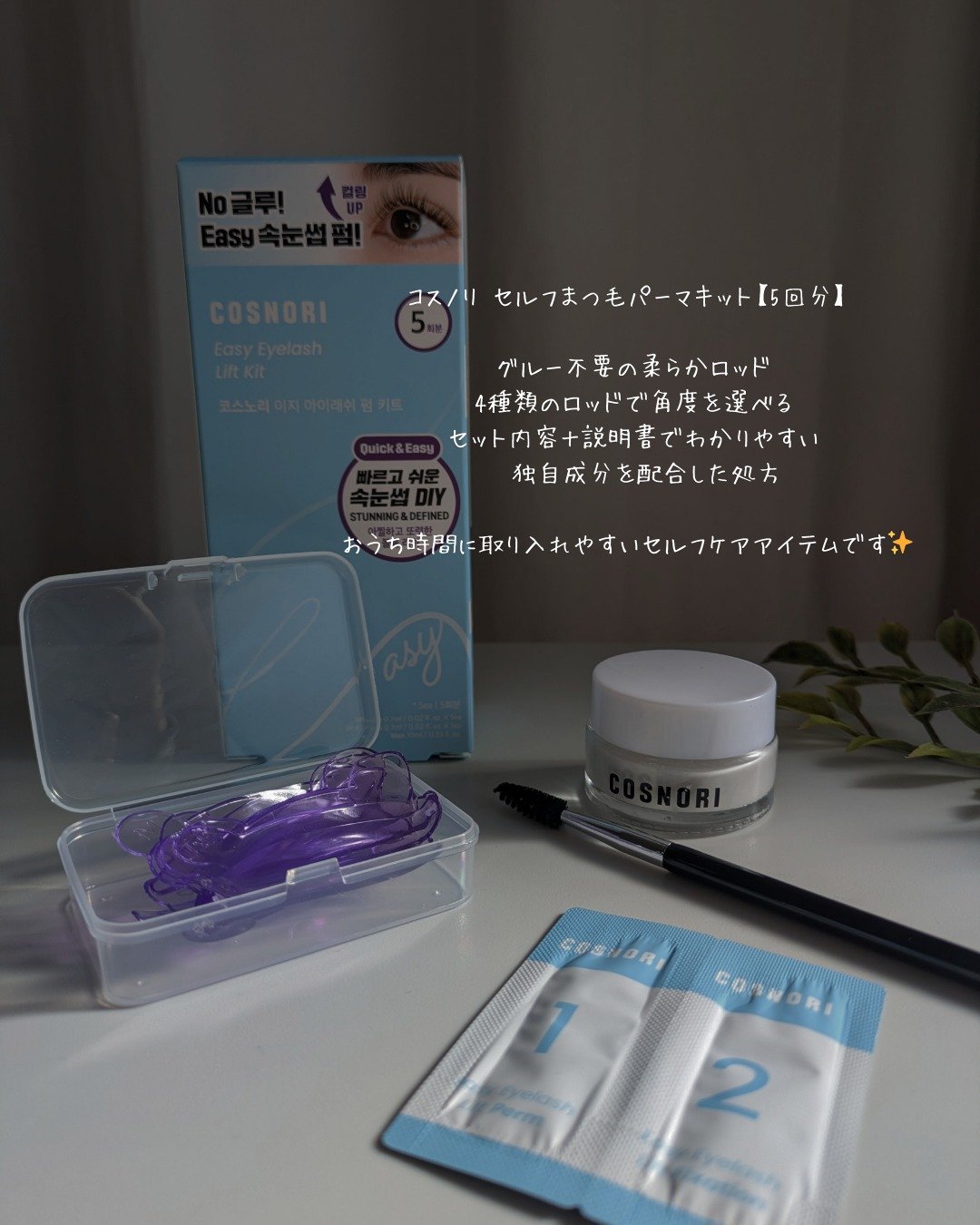 COSNORIイージーアイラッシュパーマキット\セルフまつ毛パーマにチャレンジ/すっぴんでもはっきりとした目元を作れるパッチリカールまつ毛👀✨5回分入っていてコスパ良し🙆♀️サロンへ行かなくても隙間時間で出来るから忙しい方にも!グルーが必要...