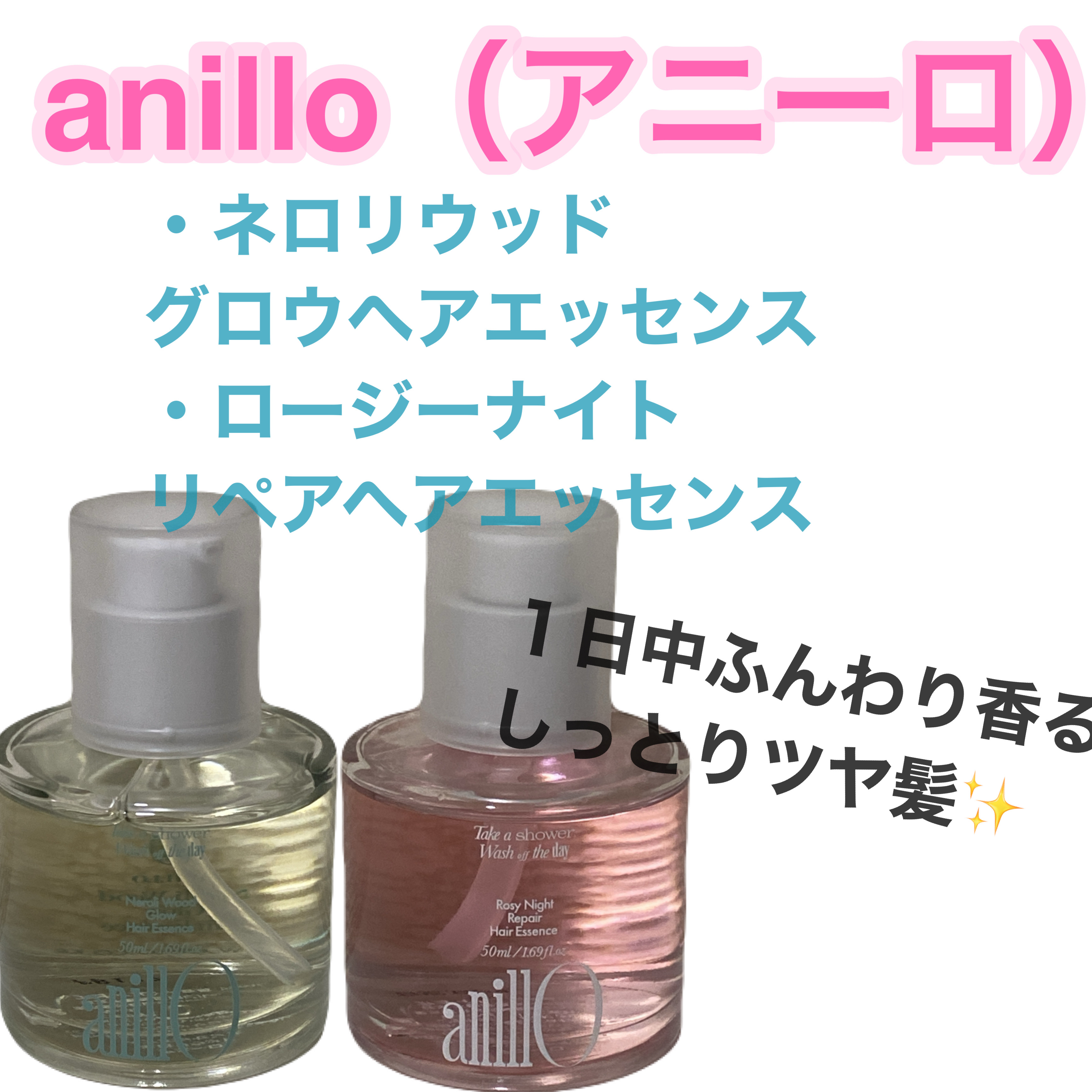 香りまで“褒められる髪”にしたいならanilloが優勝🏆 軽いのにしっとりまとまってふんわり香りが続くヘアエッセンス♡💚ネロリウッド(軽やかツヤ系) ネロリ×ホワイトフラワーの上品な香り。 カラー後のパサつき髪にも◎❤️ロージーナイト(しっと...