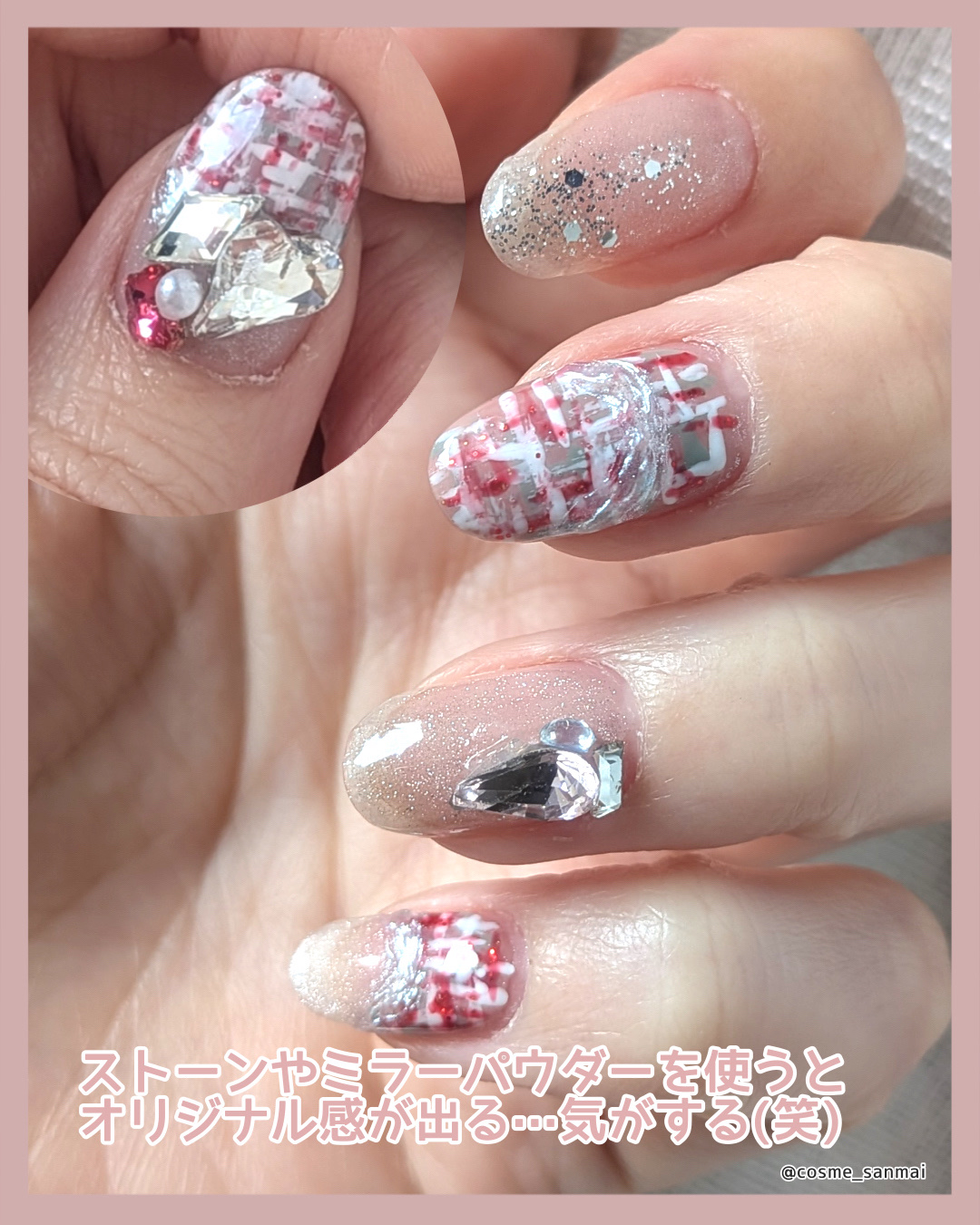 ピンクのツイード × マグネイル💖 やっとツイードネイルしたよ😌 デザインは思いつかなかったので去年作ったネイルチップから選んだよ〜💖 ↓使ったもの↓ ☑️seria Milky WHITE GOLD Baby PINK Peach PINK Girly PINK BASE & TOP