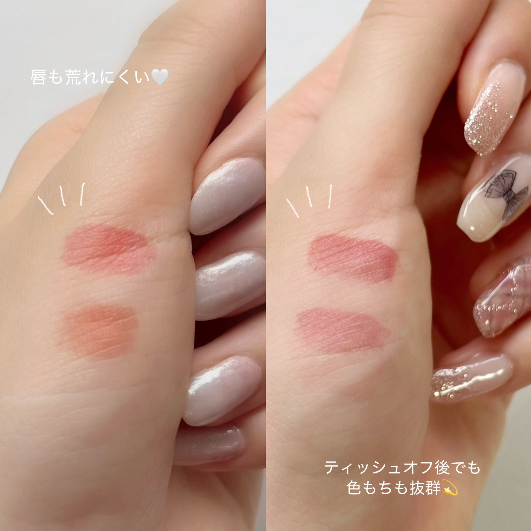 ティントなのにちゅるちゅるで乾燥しないし、皮剥けしない!🥹 (落ちにくいで有名な韓国コスメは皮剥けしがち😢) 持ち運びやすいサイズ感でパケも可愛いし、ジューシーな桃の香りも幸🍑 塗ってから放置すると、ぷるぷるツヤツヤになります🙂↕️