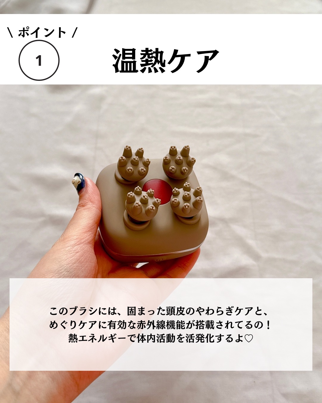 - 頭皮をグっと引き上げるブラシで極上スパ体験 4つのヘッド、合計28か所の接触点が微細な動きを放ち、確かなパワーで立体的な刺激をもたらします。また、3D頭部フィット設計により、ブラシが頭の丸みに沿って自然に頭頂部まで動くため、特別な技術は不要。頭皮にあてて軽く動かすだけで、ヘッドスパのような贅沢な体験をお楽しみいただけます。 人間工学に基づいたブラシでスッキリ洗浄 自社調査によると、女性の2人に1人が「髪だけでなく、頭皮までちゃんと洗えているか不安」に感じていますと回答※。頭皮の皮脂汚れや毛穴のつまりは、べたつきやにおいだけでなく、薄毛や抜け毛のリスクにも繋がります。「スカルプD ボーテ ビューティーヘッドスパ」は、独自技術として特許取得されている人間工学に基づいたオリジナルのブラシ設計です。シャンプー中にご使用いただくと、頭皮のスッキリ感と髪のふんわり感を体感いただけます。 ※2025年2月実施、全国20~50代女性300名への「頭皮トラブル」に関するインターネット調査より 赤外線搭載で、じんわり温熱ケア 赤外線搭載で、深部※をじんわり温めながら頭皮をほぐします。温熱ケアが、毛髪を作り出す細胞の活性化にもアプローチ。将来の美髪ケアにも繋がります。肩や首にご使用いただく際にも、温熱による血流促進で、凝りほぐしに効果が期待できます。 ※角質層まで 心地よさとフィット感を自由にカスタマイズ 「スカルプD ボーテ ビューティーヘッドスパ」のブラシ部分には、ハードタイプとソフトタイプの2種のアタッチメントが付属されています。また、強さレベルは3段階から選択可能。お好みのブラシタイプとモードで、あなたの頭皮に合ったマッサージが可能です。 <アタッチメント> ・ソフトタイプ(やさしい刺激、敏感肌・初心者向け) ・ハードタイプ(しっかりした刺激、深層マッサージ向け) <強さレベル> ① ソフトケアモード ② ナチュラルケアモード ③ ディープケアモード 防水仕様&軽量!手のひらサイズで疲れにくく、続けやすい 「スカルプD ボーテ ビューティーヘッドスパ」は、入浴中や入浴後のタイミングでご使用いただくことをおすすめしています。そのため、IPX7防水仕様で浴室でも気軽に使用可能。また、手のひらサイズで172gとスマホより軽く※、使いやすさにもこだわりました。 ※iPhone Pro Maxシリーズと比較