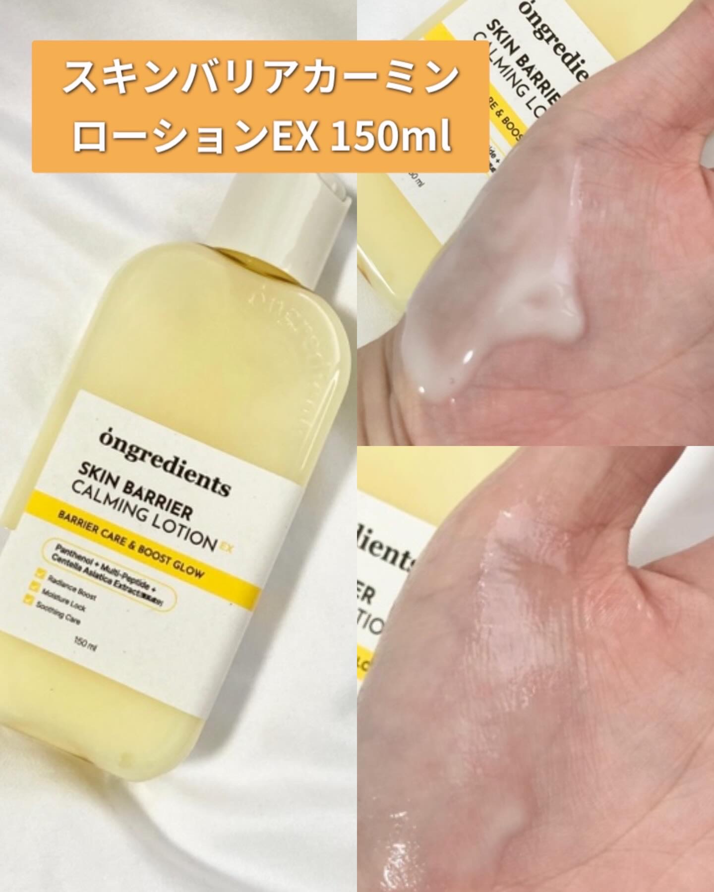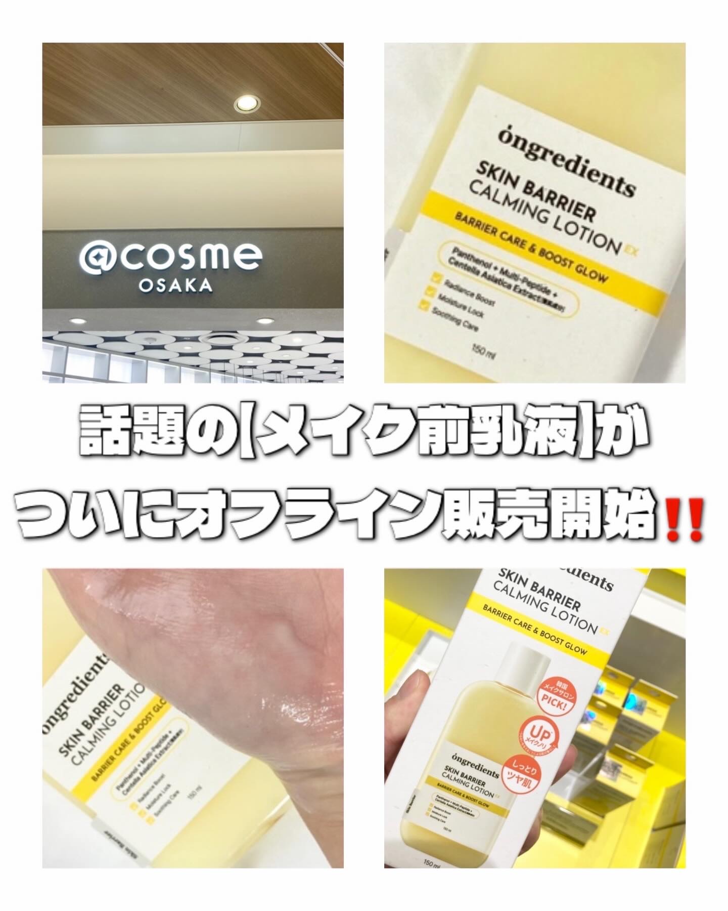 - 「ongredients(オングリディエンツ)」が、ついに日本のオフライン店舗に登場! <2025年8月30日(土)(※1)より全国のプラザ、ドン・キホーテ(※2)にて先行販売を開始> メイクノリが上がるツヤ肌乳液 【主要成分】 ・オリオソームTECA(※3) ツボクサ由来成分(※3)をオリオソーム技術で包み込み、肌に馴染みやすい設計にすることで、外的刺激を受けた肌を落ち着かせます。 ・複合ペプチド(※4)&ヴィーガンコラーゲン(※5) 肌コンディションを整え、内側から輝くようなツヤ肌を演出します。 ・パンテノール(※6) 角質層まで浸透(※7)し、うるおいのある肌印象へと導きます。 【こんな方におすすめ】 ・ツヤ感のあるメイクを好む方 ・水分感のあるツヤ肌を目指したい方 ・外的刺激によりゆらいだ肌を労わりたい方 (※1)店頭開始日となり、購入可能日は各店舗により異なります。 (※2)一部店舗を除きます。 (※3)アシアチコシド,アシアチン酸,マデカシン酸(整肌成分) (※4)ヘキサペプチド-11,オリゴペプチド-1,オリゴペプチド-2,オリゴペプチド-3,アセチルヘキサペプチド-8,カラスムギペプチド,トリペプチド-1銅,パルミトイルヘキサペプチド-12,パルミトイルペンタペプチド-4,パルミトイルテトラペプチド-7,パルミトイルトリペプチド-1,トリペプチド-1 (※5)ハイビスカスコラーゲンから抽出した加水分解コラーゲン(整肌成分) (※6)保湿成分 (※7)角質層まで