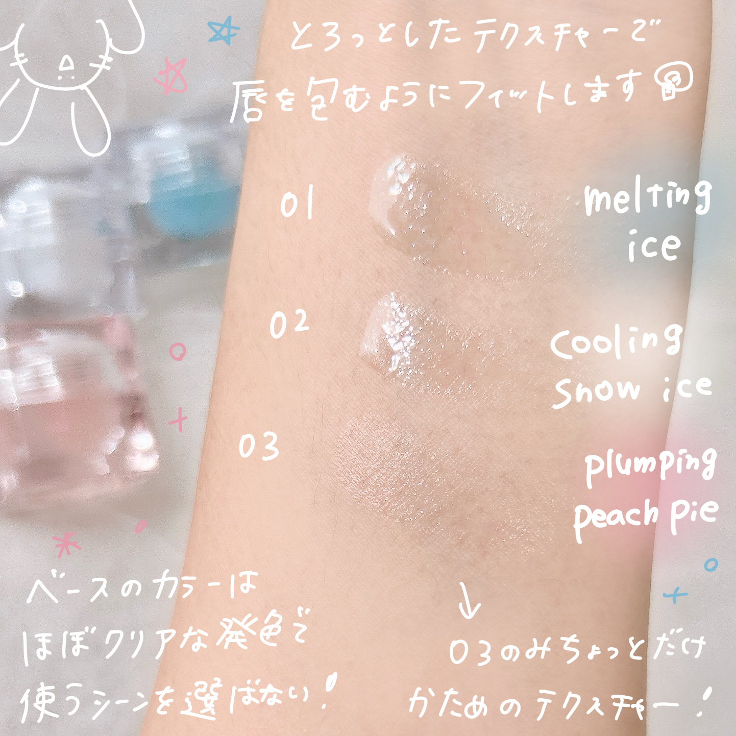 JILLならではのホワンとした発色は唯一無二。お肌が柔らかくみえる。そして見た目が乙女心にささる💘 04番と101番はグラデーションになっているのが特徴的🥺✨ 粒子がめちゃくちゃ細かくて毛穴に入りこまないので、なめらかで均一な肌に見せてくれます◎