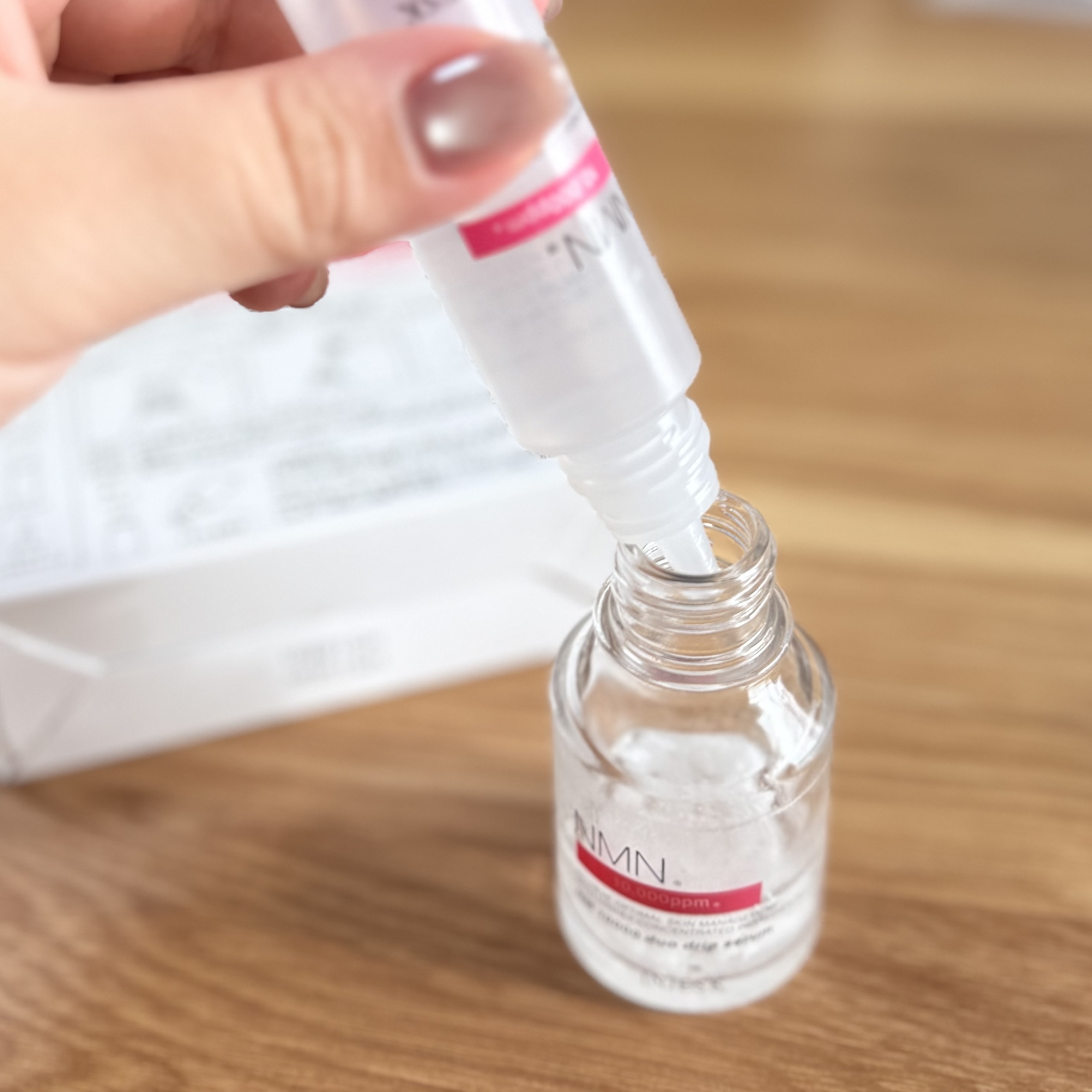 - 次世代エイジングケア※6純粋NMN※2 濃度1%※3+ナイアシンアミド※5 今、エイジングケア※6で大注目の成分、NMN※2の1%配合※3を実現。NMNに変換され、美肌サイクルをサポートするナイアシンアミド※5と合わせることで、肌が美しくなろうとする力をサポート。うるおいに満ちたふっくらとしたハリ肌へと導きます。 NMN※2をよりフレッシュな状態で使用できるよう、NMN※2はフリーズドライ技術を用いたパウダーに。さらにリキッドには、ナイアシンアミド※5を配合。2つを混ぜ合わせるとシュッと溶け、濃度を保った状態のまま使い切ることができます。 *混ぜた後は1か月を目安にご使用ください。 ※2 ニコチンアミドモノヌクレオチド(皮フコンディショニング成分)※3 製造時の濃度(2剤を混ぜた際の最終濃度)※5 皮フコンディショニング成分 ※6 年齢に応じたお手入れ