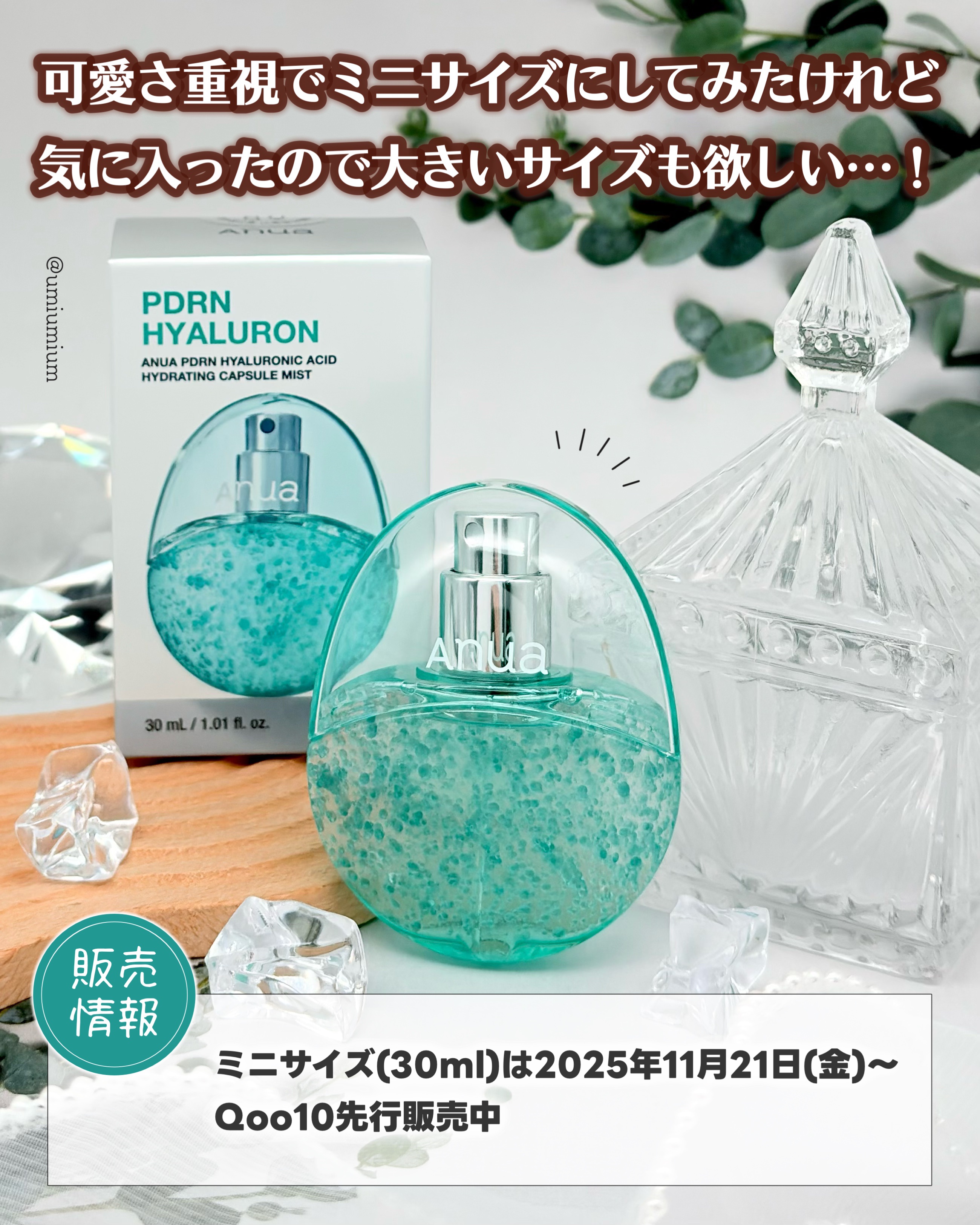 - 今回登場する「PDRNヒアルロン酸ハイドレイティングミスト」は、肌にうるおいやハリを与える「ヒアルロン酸*¹」「コラーゲン*²」「PDRN*³」を閉じ込めたANUA PDRN CAPSULE™配合の保湿ミストです。スプレーした瞬間に、エメラルド色のグロウオイルビーズが均一に広がり角質層のすみずみまで水分を満たし、うるおいによってツヤのある水光肌を演出します。 ①心地よいしっとり感を目指すレイヤリング処方 ウォータリーエッセンスとグロウオイルビーズを組み合わせ、軽やかな使い心地とうるおい感を両立。ヒアルロン酸*¹+コラーゲン*²+PDRN*³配合のANUA PDRN CAPSULE™が、ミストを振ることで肌の上でやさしくはじけて角質層までうるおいを届けます。 ②乾燥が気になる季節のうるおいケアに 季節の変わり目や冷暖房による乾燥環境でも、表面だけの保湿にとどまらず、肌の内側*4からしっとり感をキープ。乾燥によるくすみやごわつきをケアし、うるおいによる透明感のある肌へ。 ③メイク前後どちらも使えるスキンケアミスト メイク前後の保湿ケアとして活用可能。メイク前の使用ではキメを整えることでメイクノリをサポートし、メイク後の使用ではツヤ感をプラスし、メイクの仕上がりをサポートします。 ④年齢に応じたスキンケアのサポートにも PDRN*³を2000ppm配合し、うるおいとハリ感を同時にケア。乾燥による気になる目元・口元・首などへの使用もおすすめです。 *1 加水分解ヒアルロン酸(整肌成分) *2 加水分解コラーゲン(整肌成分) *3 DNA-Na(整肌成分) *4 角質層まで 2025年11月1日(土)よりQoo10メガポにて先行発売