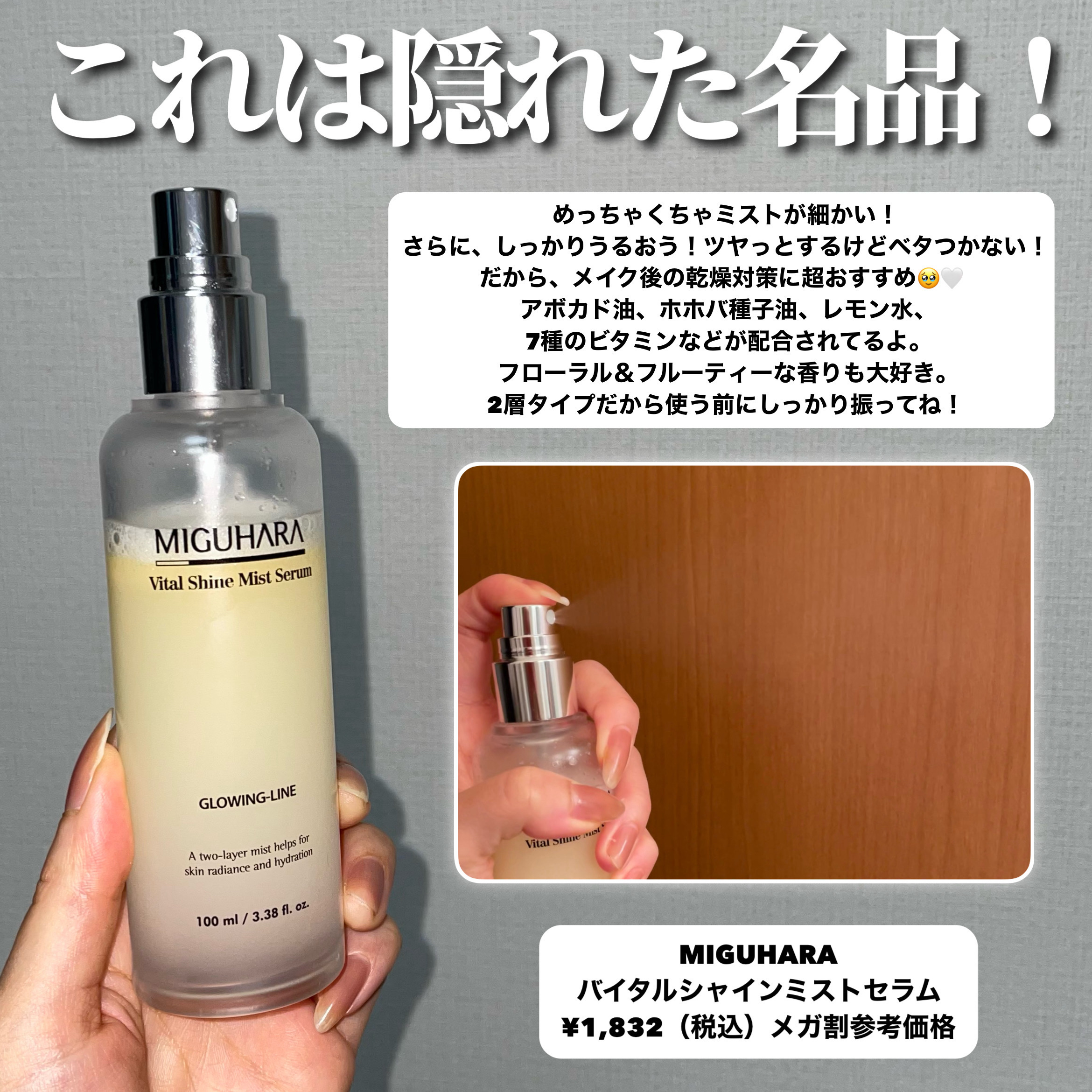 | メイクをした上にかけるミストです!粒子が細かいミストなので心地よく使えます。 | 詳細を見る | ||