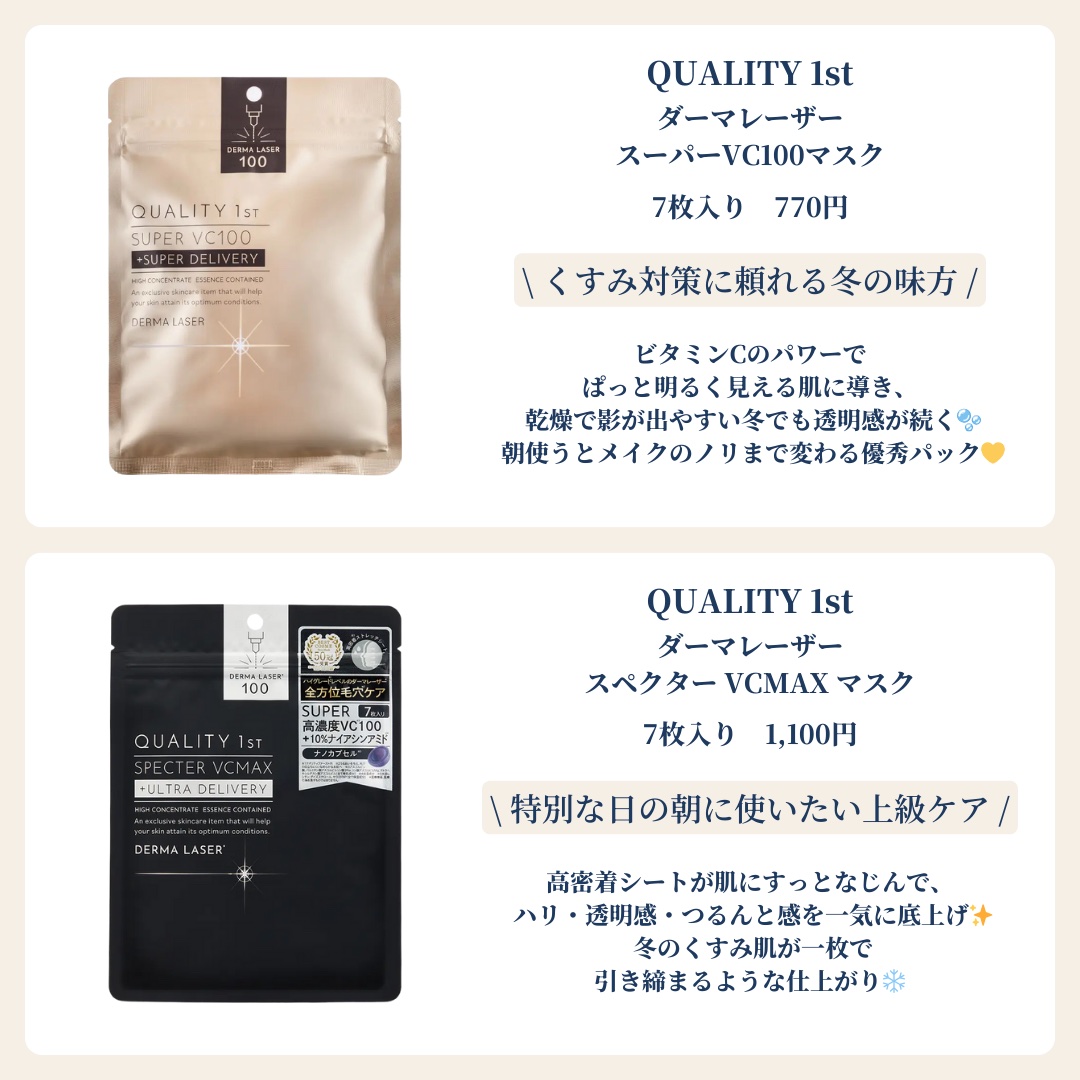 ☑️クオリティファーストダーマレーザースペクターVCMAXマスク¥1,100☑️ダーマレーザースーパーレチノール100マスク¥770☑️ルルルンルルルンハイドラEXマスク7枚入 ¥880〜ドラストでサクッと購入できるのが何よりも嬉しい! 毎日...