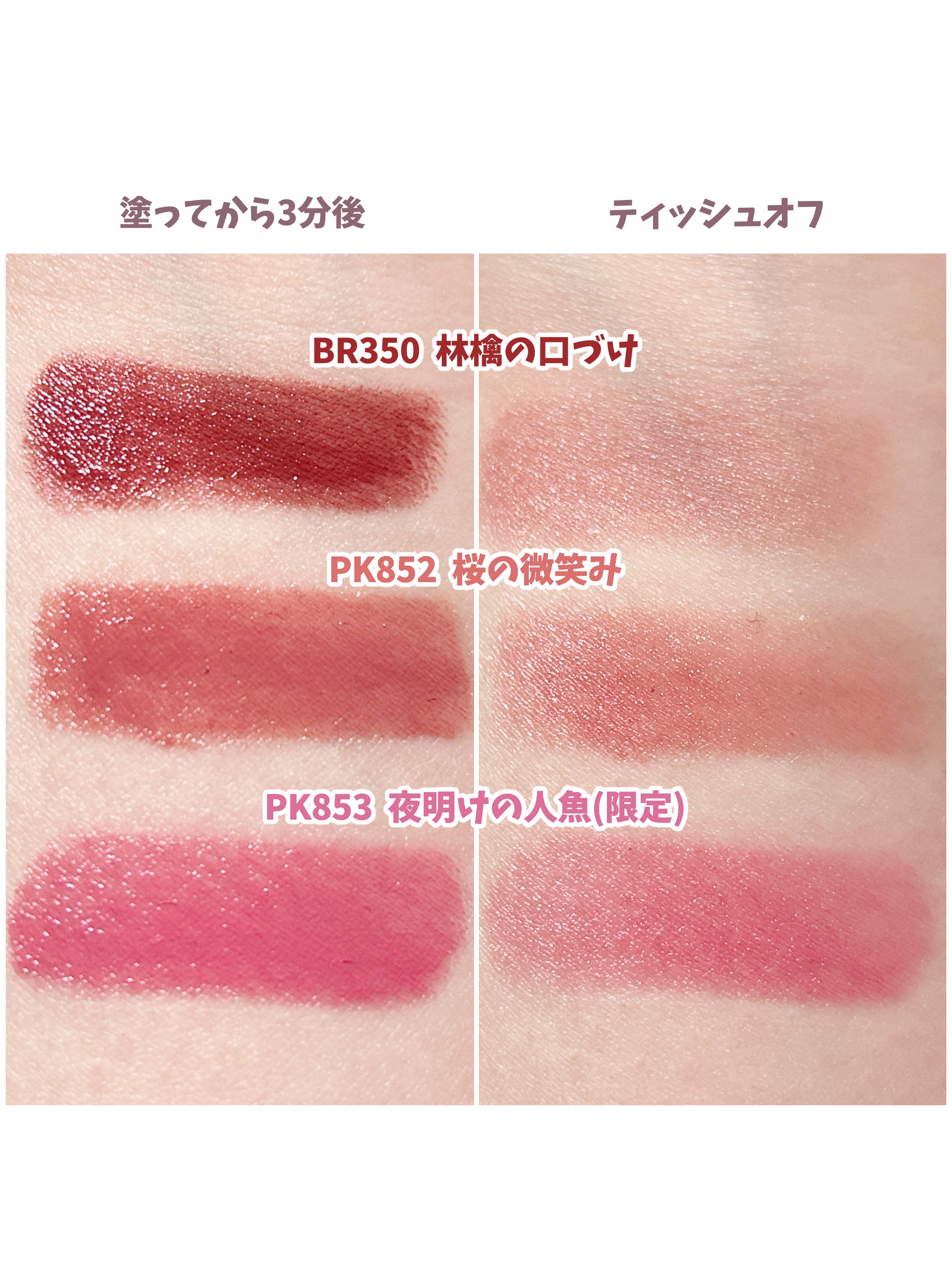 - <BE351 桃のはにかみ> ジフェニルジメチコン、デカエチルヘキサン酸ポリグリセリル-10、(VP/ヘキサデセン)コポリマー、イソドデカン、トリメチルシロキシフェニルジメチコン、テトラエチルヘキサン酸ペンタエリスリチル、トリイソステアリン酸ポリグリセリル-2、合成ワックス、ジメチコン、フェニルトリメチコン、イソステアリン酸デキストリン、DPG、トコフェロール、ヒアルロン酸Na、BHT、(エイコセン/ビニルピロリドン)コポリマー、(エチレン/プロピレン)コポリマー、カルナウバロウ、キャンデリラロウ、キャンデリラロウエステルズ、ジメチルシリル化シリカ、スクワラン、トリイソステアリン酸イソプロピルチタン、ハイドロゲンジメチコン、メチコン、水酸化Al、炭酸Ca、酸化チタン、酸化鉄、黄4、赤202 <BR350 林檎の口づけ> ジフェニルジメチコン、デカエチルヘキサン酸ポリグリセリル-10、(ビニルピロリドン/ヘキサデセン)コポリマー、イソドデカン、トリメチルシロキシフェニルジメチコン、テトラエチルヘキサン酸ペンタエリスリチル、トリイソステアリン酸ポリグリセリル-2、合成ワックス、ジメチコン、フェニルトリメチコン、イソステアリン酸デキストリン、DPG、トコフェロール、ヒアルロン酸Na、BHT、(エイコセン/ビニルピロリドン)コポリマー、(エチレン/プロピレン)コポリマー、アルミナ、カルナウバロウ、キャンデリラロウ、キャンデリラロウエステルズ、シリカ、ジメチルシリル化シリカ、スクワラン、ハイドロゲンジメチコン、炭酸Ca、酸化チタン、酸化鉄、黄4、赤202 <BR352 駆け引きワイン(限定)> ジフェニルジメチコン、デカエチルヘキサン酸ポリグリセリル-10、(VP/ヘキサデセン)コポリマー、イソドデカン、トリメチルシロキシフェニルジメチコン、テトラエチルヘキサン酸ペンタエリスリチル、合成ワックス、ジメチコン、フェニルトリメチコン、トリイソステアリン酸ポリグリセリル-2、イソステアリン酸デキストリン、DPG、トコフェロール、ヒアルロン酸Na、BHT、(エイコセン/ビニルピロリドン)コポリマー、(エチレン/プロピレン)コポリマー、アルミナ、カルナウバロウ、キャンデリラロウ、キャンデリラロウエステルズ、シリカ、ジメチルシリル化シリカ、スクワラン、ハイドロゲンジメチコン、炭酸Ca、酸化チタン、酸化鉄、黄4、赤202 <OR250 海星の恋心> ジフェニルジメチコン、デカエチルヘキサン酸ポリグリセリル-10、(ビニルピロリドン/ヘキサデセン)コポリマー、イソドデカン、トリメチルシロキシフェニルジメチコン、トリイソステアリン酸ポリグリセリル-2、テトラエチルヘキサン酸ペンタエリスリチル、合成ワックス、ジメチコン、フェニルトリメチコン、イソステアリン酸デキストリン、DPG、トコフェロール、ヒアルロン酸Na、BHT、(エイコセン/ビニルピロリドン)コポリマー、(エチレン/プロピレン)コポリマー、アルミナ、カルナウバロウ、キャンデリラロウ、キャンデリラロウエステルズ、シリカ、ジメチルシリル化シリカ、スクワラン、ハイドロゲンジメチコン、炭酸Ca、酸化チタン、酸化鉄、黄4、赤202 <PK850 うさぎの恋人> ジフェニルジメチコン、デカエチルヘキサン酸ポリグリセリル-10、(ビニルピロリドン/ヘキサデセン)コポリマー、イソドデカン、トリメチルシロキシフェニルジメチコン、テトラエチルヘキサン酸ペンタエリスリチル、トリイソステアリン酸ポリグリセリル-2、合成ワックス、ジメチコン、フェニルトリメチコン、イソステアリン酸デキストリン、DPG、トコフェロール、ヒアルロン酸Na、BHT、(エイコセン/ビニルピロリドン)コポリマー、(エチレン/プロピレン)コポリマー、アルミナ、カルナウバロウ、キャンデリラロウ、キャンデリラロウエステルズ、シリカ、ジメチルシリル化シリカ、スクワラン、ハイドロゲンジメチコン、炭酸Ca、酸化チタン、酸化鉄、黄4、赤202 <PK851 わがままな肉球> ジフェニルジメチコン、デカエチルヘキサン酸ポリグリセリル-10、(ビニルピロリドン/ヘキサデセン)コポリマー、イソドデカン、トリメチルシロキシフェニルジメチコン、テトラエチルヘキサン酸ペンタエリスリチル、トリイソステアリン酸ポリグリセリル-2、合成ワックス、ジメチコン、フェニルトリメチコン、イソステアリン酸デキストリン、DPG、トコフェロール、ヒアルロン酸Na、BHT、(エイコセン/ビニルピロリドン)コポリマー、(エチレン/プロピレン)コポリマー、アルミナ、カルナウバロウ、キャンデリラロウ、キャンデリラロウエステルズ、シリカ、ジメチルシリル化シリカ、スクワラン、ハイドロゲンジメチコン、炭酸Ca、酸化チタン、酸化鉄、黄4、赤202 <PK852 桜の微笑み> ジフェニルジメチコン、デカエチルヘキサン酸ポリグリセリル-10、(VP/ヘキサデセン)コポリマー、イソドデカン、トリメチルシロキシフェニルジメチコン、テトラエチルヘキサン酸ペンタエリスリチル、合成ワックス、トリイソステアリン酸ポリグリセリル-2、ジメチコン、フェニルトリメ