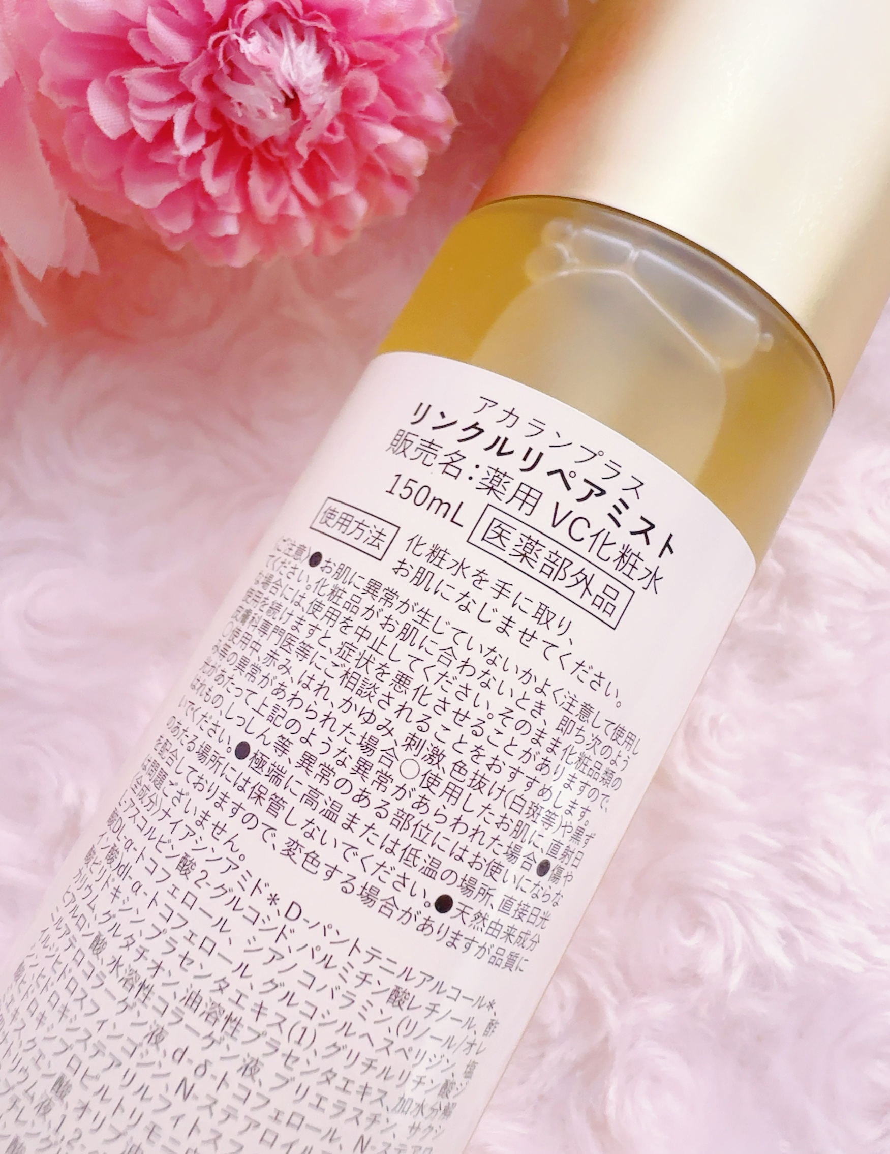 - <リンクルリペアミスト> 有効成分 ナイアシンアミド、D-パントテニルアルコール その他の成分 L-アスコルビン酸 2-グルコシド、パルミチン酸レチノール、酢酸DL-α-トコフェロール、シアノコバラミン、(リノール/オレイン酸)dl-α-トコフェロール、グルコシルヘスペリジン、塩酸ピリドキシン、プラセンタエキス(1)、グリチルリチン酸ジカリウム、グルタチオン、油溶性プラセンタエキス、加水分解ヒアルロン酸、水溶性コラーゲン液、ブリエラスチン、サクシニルアテロコラーゲン液、d-δ-トコフェロール、N-ステアロイルジヒドロスフィンゴシン、N-ステアロイルフィトスフィンゴシン、ヒドロキシステアリルフィトスフィンゴシン、ヒアルロン酸ヒドロキシプロピルトリモニウム、ヨモギエキス、ドクダミエキス、クエン酸、オリブ油、ヒドロキシエタンジホスホン酸四ナトリウム液、1,2-ペンタンジオール、精製水、ジグリセリン、1,3-ブチレングリコール、トリメチルグリシン、濃グリセリン、モノラウリン酸ポリグリセリル、オウバクエキス、クエン酸ナトリウム、ジエチレントリアミン五酢酸五ナトリウム液、フィトステロール、リン酸水素二ナトリウム、リン酸二水素カリウム、水素添加大豆リン脂質、パラオキシ安息香酸エステル、香料、フェノキシエタノール