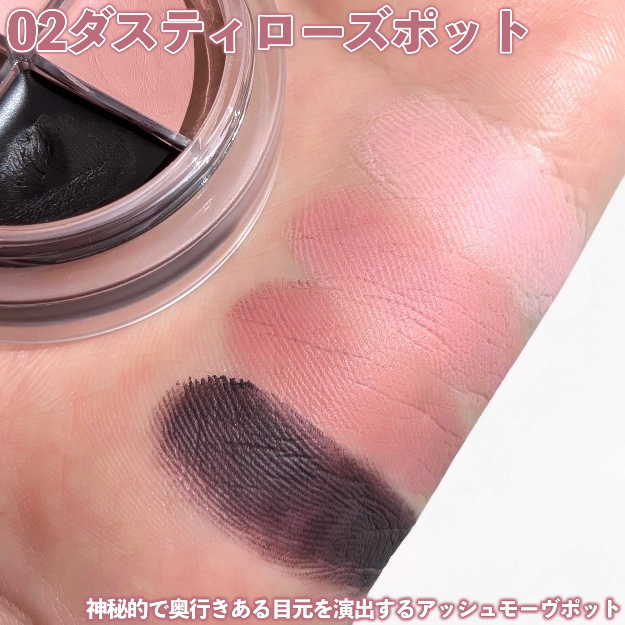 流行りのワントーンメイクが楽しめるのマルチパレットが登場👏 アイからチーク、ハイライターまで水が浸透するように澄んで鮮やかに染み込む水彩画発色🖼️ 持ち運びしやすいサイズ感でアイシャドウからハイライトまでこれ一つでお直しできて超便利😍 02レイジーローズは彩度の抑えられたニュートラルなカラーがどなたでも使いやすそう🥀