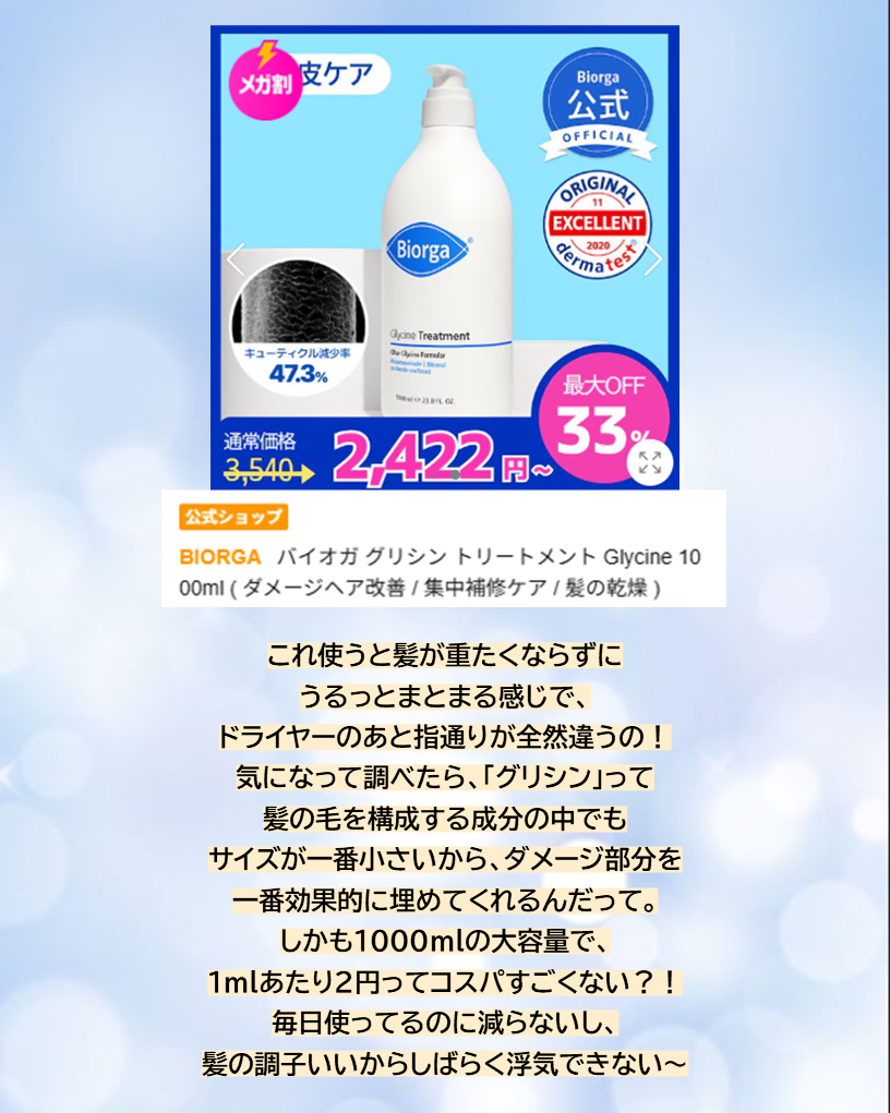 | ヘアケア・スタイリングランキング第124位 | ブリーチで傷み切った私の髪も潤って、指通りよくサラサラになったよ❤️ | 詳細を見る | |