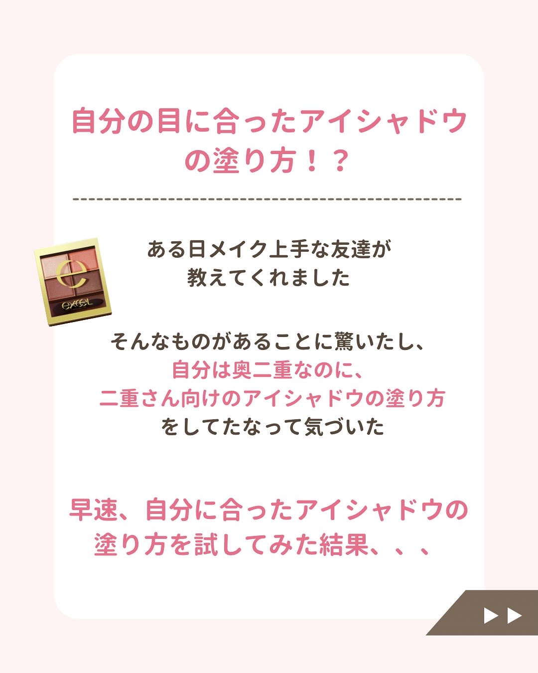 自分に合ったアイシャドウの見つけ方はたくさんありますが…今回はこの2点についてお伝えしていきます! パーソナルカラーを参考にする ☑目の位置を参考にする 詳しい内容は投稿の画像をチェック!