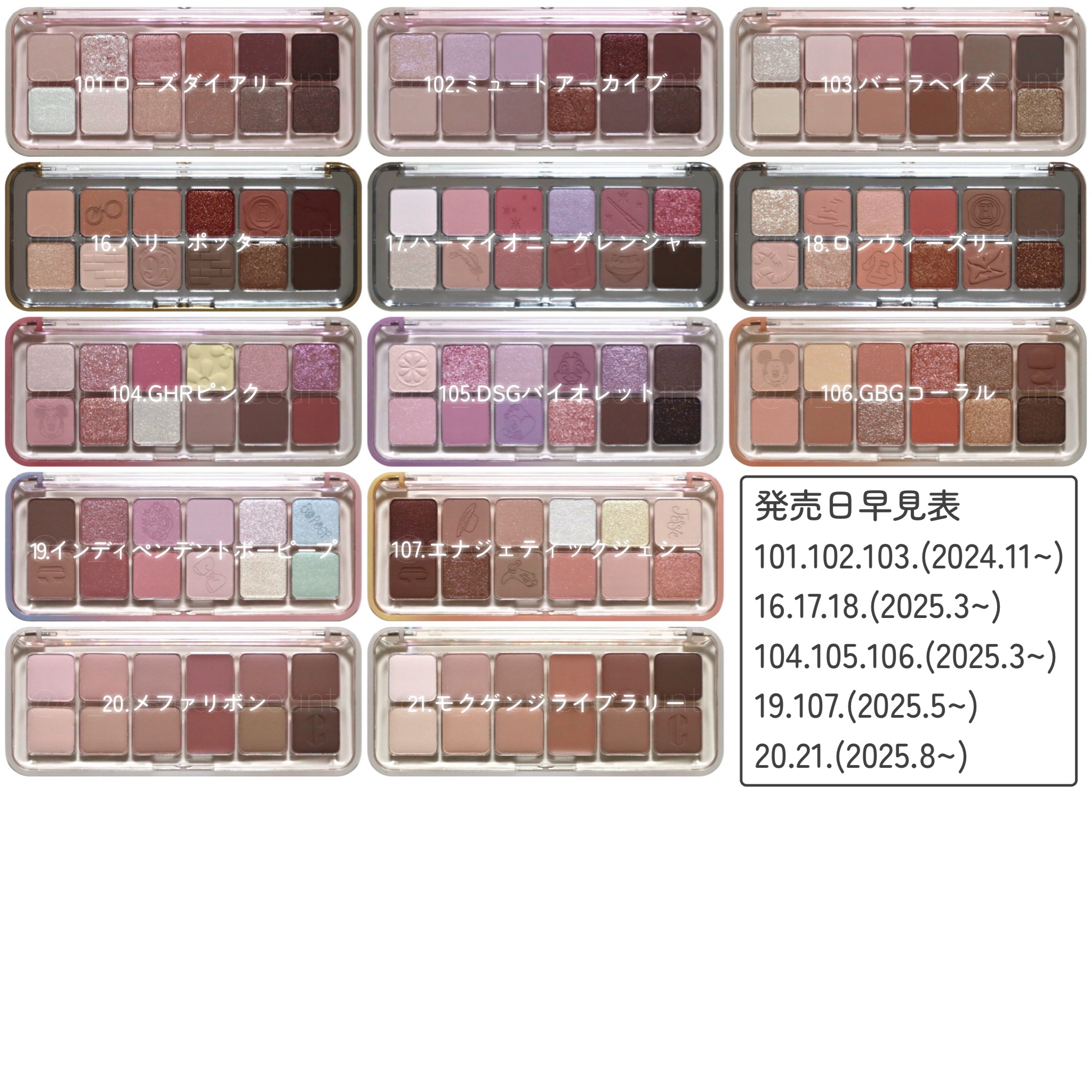 - 軽やかテクスチャーが目元に密着し、抜け感のある色使いが楽しめるデイリーパレット <101 ローズダイアリー(ROSE DIARY)> オーナメントを飾り付けたローズツリーのようにほのかに輝くウォームローズピンクカラー(イエベ秋)。 <102 ミュートアーカイブ(MUTE ARCHIVE)> 少女たちのピンキーなホームパーティームードを盛り込んだクールでヌーディーなミューテッドモブカラー(ブルべ夏ミュート)。 <103 バニラヘイズ(VANILLA HAZE)> 焼きたてのジンジャークッキーのように暖かく香ばしいウォームミュートカラー(イエベ秋ミュート)。 <104 GHR ピンク(GYEONGHOERU FLOWER FESTIVAL)> 春の日の美しく優雅な色を詰め込んだピンクカラーパレット。イエベ春&ブルベ夏におすすめのパレットです。 <105 DSG バイオレット(DEOKSUGUNG STONE WALL ROAD)> ほんのりピンクがかった柔らかなモーブカラーパレット。ブルベ夏&ブルベ冬におすすめのパレットです。 <106 DBG コーラル(GYEONGBOKGUNG STROLL)> 明るい日差しの色を取り入れたデイリーなコーラルカラー。イエベ春&ブライト秋におすすめのパレットです。