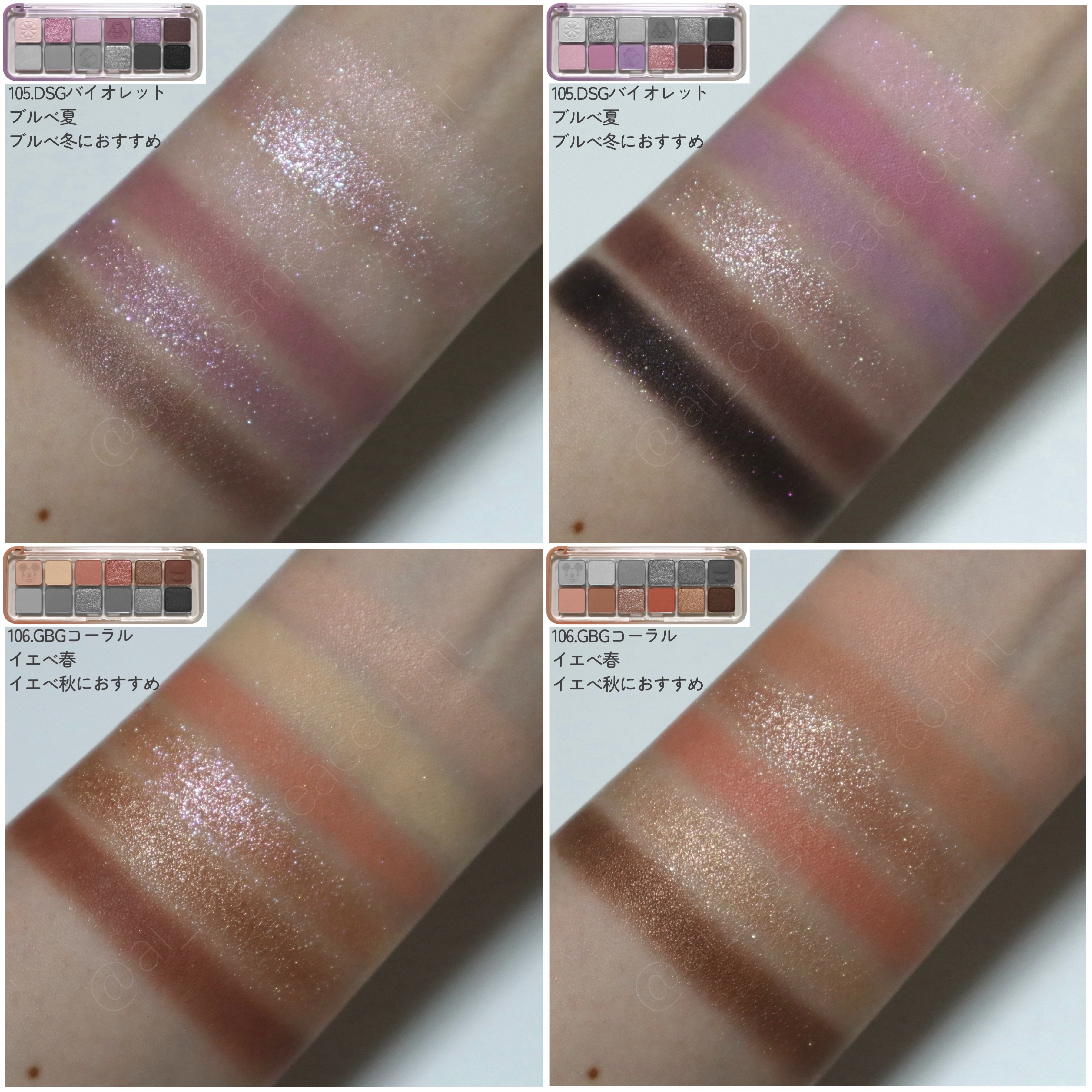 - 軽やかテクスチャーが目元に密着し、抜け感のある色使いが楽しめるデイリーパレット <101 ローズダイアリー(ROSE DIARY)> オーナメントを飾り付けたローズツリーのようにほのかに輝くウォームローズピンクカラー(イエベ秋)。 <102 ミュートアーカイブ(MUTE ARCHIVE)> 少女たちのピンキーなホームパーティームードを盛り込んだクールでヌーディーなミューテッドモブカラー(ブルべ夏ミュート)。 <103 バニラヘイズ(VANILLA HAZE)> 焼きたてのジンジャークッキーのように暖かく香ばしいウォームミュートカラー(イエベ秋ミュート)。 <104 GHR ピンク(GYEONGHOERU FLOWER FESTIVAL)> 春の日の美しく優雅な色を詰め込んだピンクカラーパレット。イエベ春&ブルベ夏におすすめのパレットです。 <105 DSG バイオレット(DEOKSUGUNG STONE WALL ROAD)> ほんのりピンクがかった柔らかなモーブカラーパレット。ブルベ夏&ブルベ冬におすすめのパレットです。 <106 DBG コーラル(GYEONGBOKGUNG STROLL)> 明るい日差しの色を取り入れたデイリーなコーラルカラー。イエベ春&ブライト秋におすすめのパレットです。