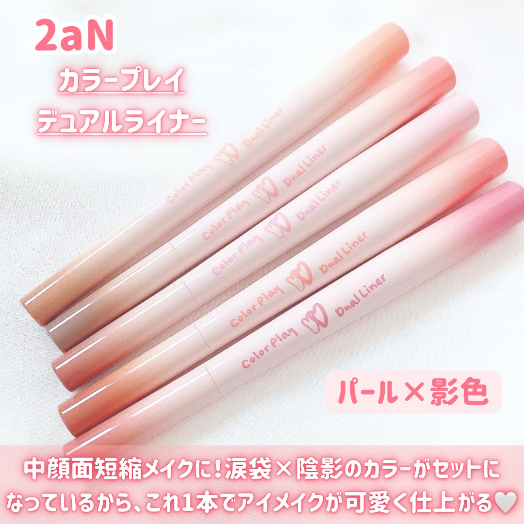 2aN「カラープレイデュアルライナー」全5種✔️涙袋も陰影もこれ1本で3mm陰影ライナーと5mmパールライナーのデュアルライナーでふっくらした涙袋を演出〈ハイライト涙袋袋におすすめカラー〉01ハニーピーチはちみつピーチカラーとソフトブラウン陰...