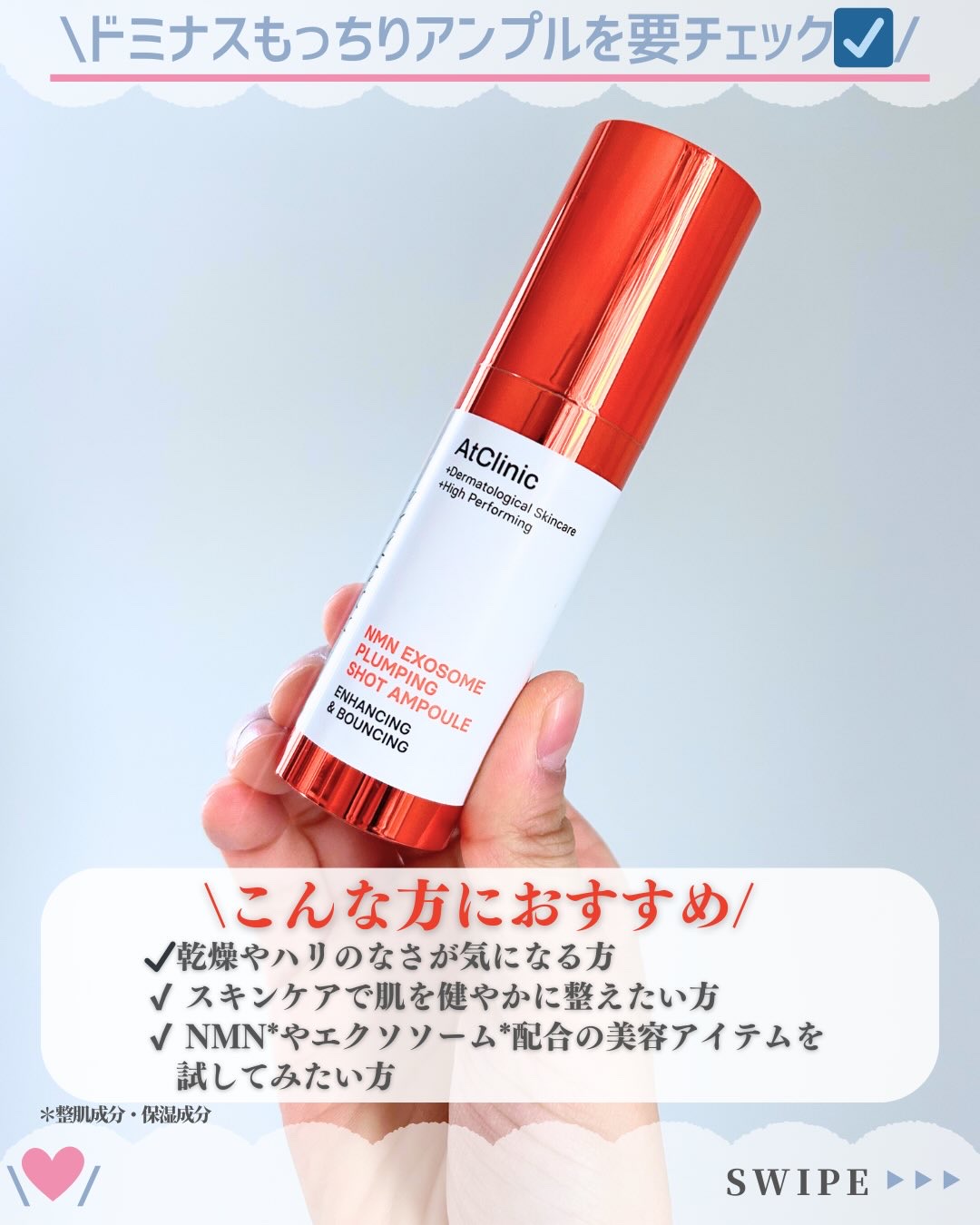 DOMINASアットクリニックNMNプランピングショット次世代抗老化成分のNMN+エクソソーム老化により弾力を失い凹んだお肌の弾力を満たしぷりっとお肌に導いてくれる、プランピンクショットオレンジ色のとろみのあるテクスチャーでスルスル伸びて...