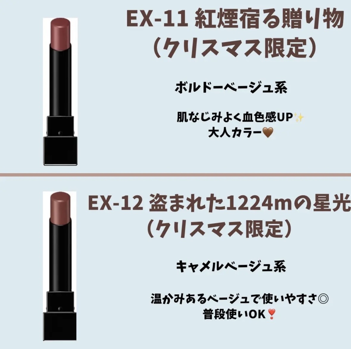 - 落ちにくさも美発色もよくばりたい、つけたての色が長時間持続する人気の口紅リップモンスター。 唇から蒸発する水分を活用して密着ジェル膜に変化する独自技術※で、つけたての色が長時間持続。 高発色&保湿。 ※当社独自の色持ち技術 ■花火のようにまぶしくきらめく 繊細なラメが際立つ限定色 EX-6 ピンクカラー×青ラメ【ロケット花火流星群】 EX-7 オレンジカラー×黄&緑ラメ【100万発の線香花火】 EX-8 レッドカラー×緑ラメ【打ち上げ花火ブランコ】 ■深みレッド系カラーの限定色 EX-9 戦慄の喜笑 (限定色) EX-10 狂気の怒号 (限定色) 【2025クリスマスコフレ】 落ちにくいリップモンスターから、唇の血色感を底上げする ホリデーシーズン限定の熱感ニュアンスベージュ系カラー登場。 EX-11 紅煙宿る贈り物(限定色):ボルドーベージュ系 EX-12 盗まれた1224mの星光(限定色):キャメルベージュ系