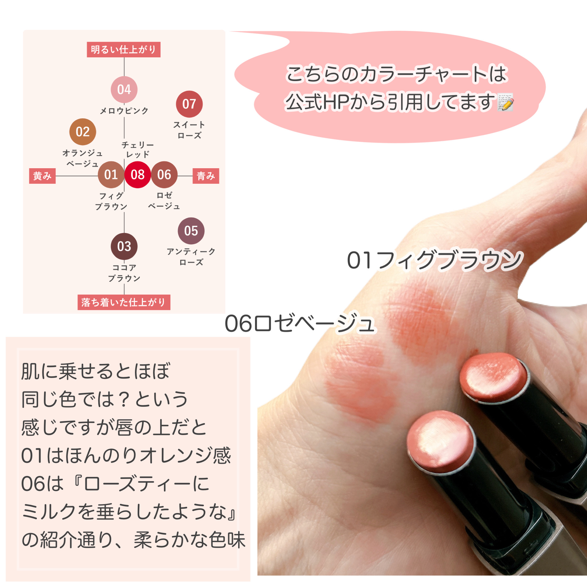 どの色も透け感があり濃すぎない発色なので使いやすいです☺️♡ 01フィグブラウン…柔らかい赤みを感じる、万能ピンクブラウン 05アンティークローズ…肌の透明感を引き立てる、落ち着いた雰囲気のくすみローズ