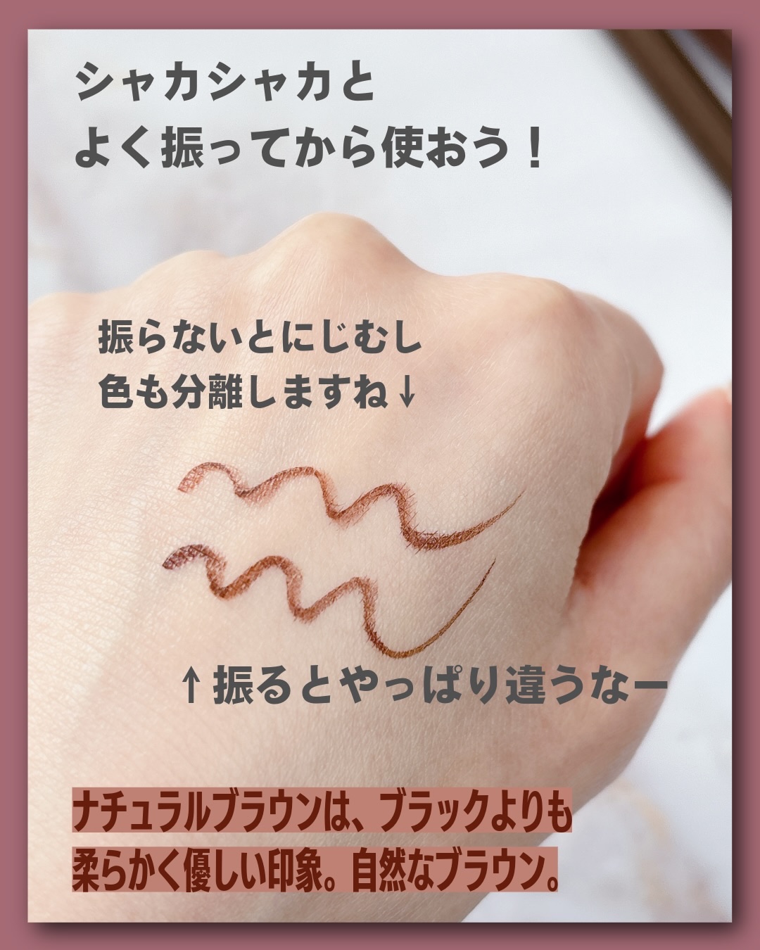 - 筆先までずっとなめらか、目尻で感動するリキッドアイライナー。 必要な量が肌にのる新設計で、まぶたの上をすべるような、滑らかな描き心地。しなやかでコシのある筆が、筆圧のコントロールを容易にし、太いラインも細いラインも思い通りに仕上げます。水、汗、涙に強いウォータープルーフタイプなのに、通常洗顔で簡単オフ。肌に色素が残らない顔料を使用。5種類の美容液成分を従来品の200%配合し、メイクしながら目元ケアまで。 ●ブラウンブラック ※2020年9月12日 バラエティショップ先行発売 ●漆黒ブラック ※2020年12月頃発売予定 ●ナチュラルブラウン ※2020年12月頃発売予定 ●シフォンブラウン 「毎日メイクに透明感と抜け感」 ブラウンでも、グレーでも、ベージュでもないニュアンスカラー。 自然な印影で素の目元を際立て、頑張りすぎない、ふんわりとした目元に。 ●アプリコットブラウン 「じゅわっと血色感。 肌に馴染むおしゃれカラー」 温かみのあるアプリコットがじゅわっと滲む血色感を目元に演出。 肌馴染みが良いので、カラーライナーに抵抗がある方もブラウンの延長線上で楽しめる、使いやすい色味です。 ”ちょっとオシャレ”な空気感を演出するカラー。 ●ピンクショコラ アイライナー 「ピンクが溶け込む濃厚ブラウン」 肌馴染みが良く、目元にじんわり血色感をプラス。 さりげなく女性らしさが加速するようなカラー。 ●ピスタチオラテ (2022年7月29日(金)発売) 「“目尻”に抜け感アクセント」 肌に馴染むのに映える絶妙なグリーン。 トレンドカラーに“くすみ”と“抜け感”をプラスしたまろやかな発色。 ●マスタードブラウン 「“イエロー”が揺れる、大人の洒落色」 (2022年7月29日(金)発売) まるで太陽のような暖かさを感じる新しいブラウン。 ほんのり感じるイエローでメイクが一気に垢抜ける稀有な色。 ●シフォンピンク(2023年2月10日発売) 「ふんわり柔らか"まろみピンク"」 甘くなりすぎない青みニュアンスで目元の透明感UP。 目元を引き締め、ピンクメイクにありがちな腫れぼったさを解消。 ●ミルクカプチーノ(2023年4月21日発売) まろやかな深みの“優しい締め色” どんなメイクにも合わせやすいカラー。 自然な陰影でさりげなく目幅を拡張します。 ●グレーカシミア(2023年10月1日発売) ブラウンがほんのり溶け込んだ、暖色グレー まろやかな発色で、パーソナルカラーを問わず肌に馴染む 目元の陰影になりすまし、抜け感と目力を欲張りに叶える ●ダークフィグ(2024年6月1日発売) するする”なめらか。描きやすいのに、落ちにくい。 クッキリ可愛いほの甘ダークブラウン ●ピーチモカ(2024年8月1日発売) ふわっと自然に盛れる“桃色ブラウン” ほんのり血色感で目元にうるみ感を演出 ●スターダストブラウン(2024年12月11日発売) キラッと繊細に輝く''星屑ブラウン'' 透け感のあるダークブラウンの色味とラメの輝きが、目元に艶のある立体感を演出 ●チャコールモカ(2025年4月10日発売) 目元を締める''深みグレージュ'' 黄みや赤みに偏りすぎない絶妙な色設計で、自然に目元を強調