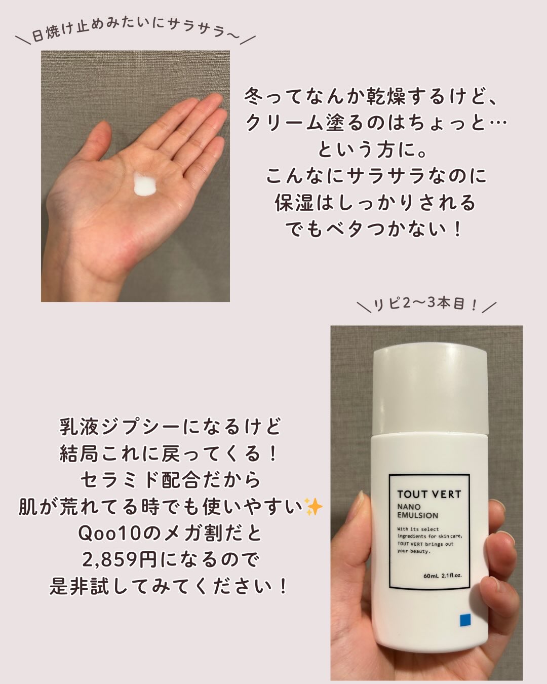 【#TOUTVERT(#トゥベール)】#ナノエマルジョン\大人気のシャバシャバ乳液使ってみたら、やっぱり凄かった/私の使ってみたナノエマルジョンは浸透湿潤セラミド(セラミド類似成分)を10%も配合していて、ナノカプセル化されてるから浸透力も高...