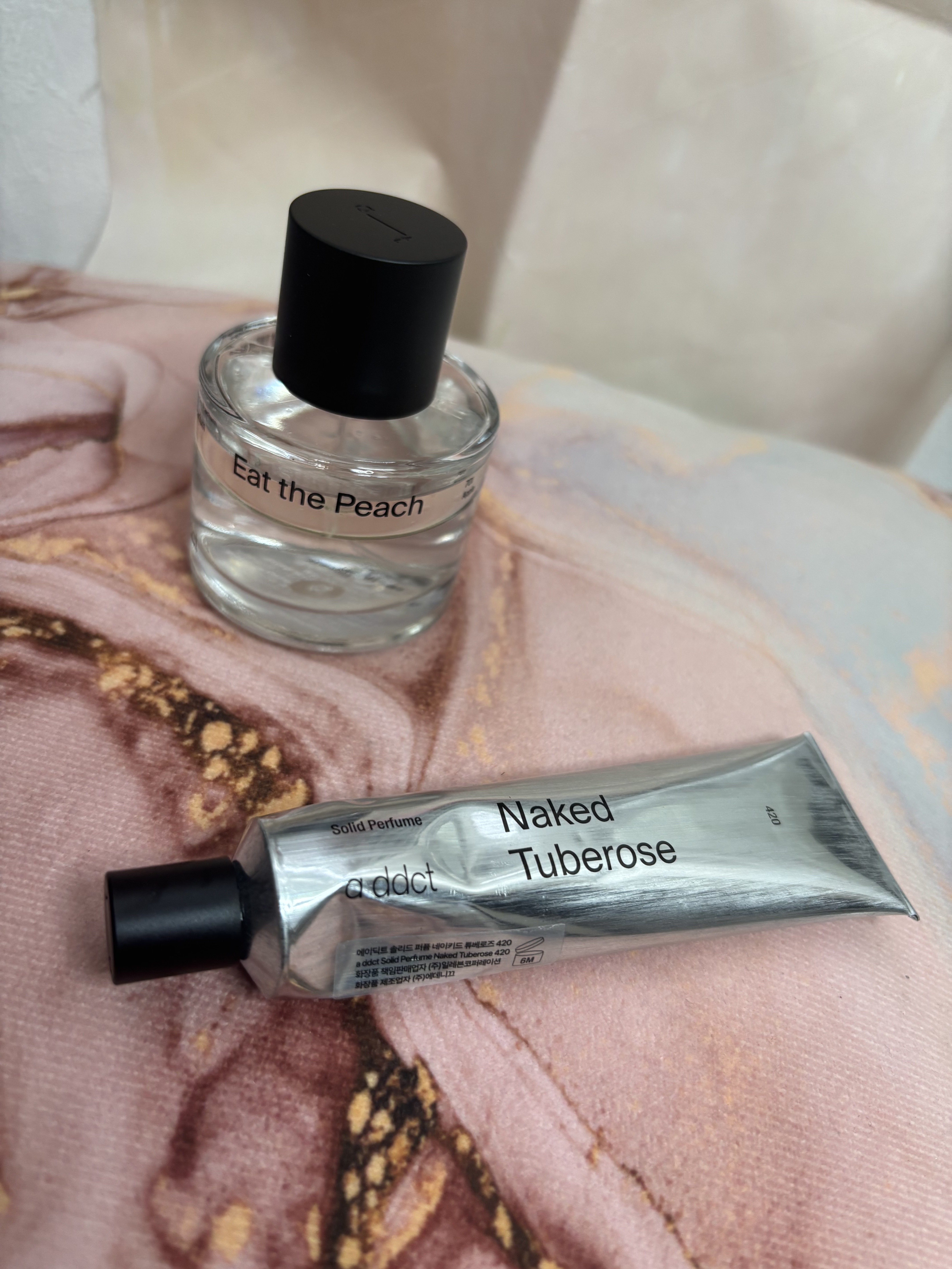 ✴︎addctエイディクトの訳アリイベントに当選して素敵なボックスをいただきました🖤オートパフュームイートザピーチとソリッドパフュームミュゲ。(どちらもリニューアル前のパッケージです!ブランド名もaddictからaddctになったそう。)ふた...