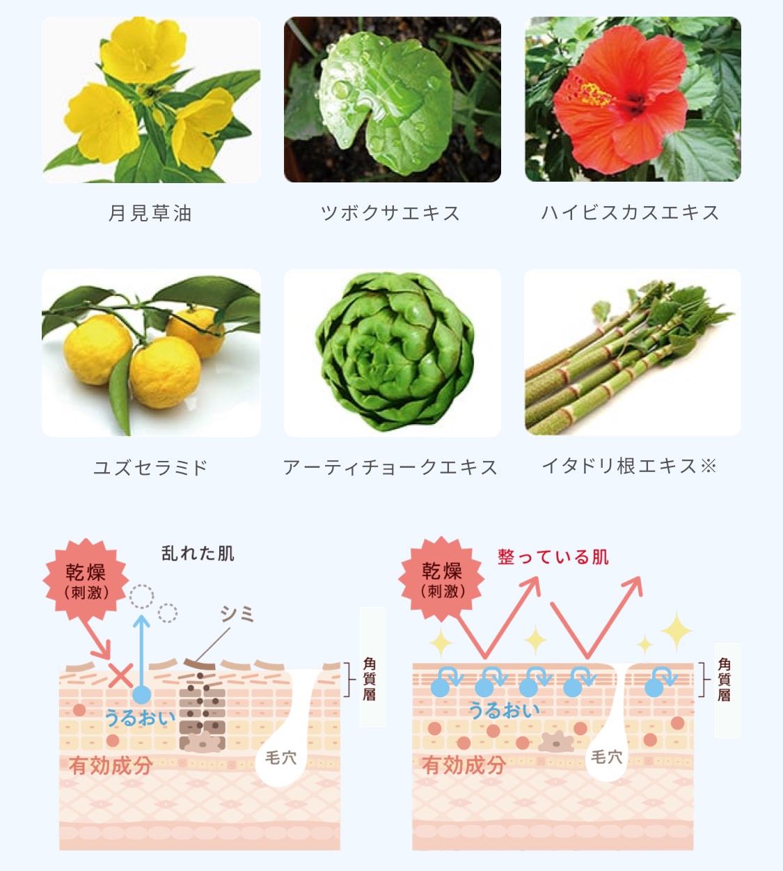 - <100g> プラセンタエキス(1)、グリチルリチン酸ジカリウム、精製水、1,3-ブチレングリコール、濃グリセリン、流動イソパラフィン、2-エチルヘキサン酸セチル、リン酸L-アスコルビルマグネシウム、月見草油、ツボクサエキス、アーティチョークエキス、ユズセラミド、ハイビスカスエキス(2)、イタドリエキス、ヒアルロン酸ナトリウム(2)、ラフィノース水和物、d-δ-トコフェロール、ジリノール酸ジ(フィトステリル/イソステアリル/セチル/ステアリル/ベヘニル)、メチルポリシロキサン、重質流動イソパラフィン、硬化ナタネ油アルコール、キサンタンガム、カルボキシビニルポリマー、ポリオキシエチレン硬化ヒマシ油、アクリル酸ナトリウム・アクリロイルジメチルタウリン酸ナトリウム共重合体/イソヘキサデカン/ポリソルベート80、親油型モノステアリン酸グリセリル、セスキオレイン酸ソルビタン、水酸化カリウム、エデト酸二ナトリウム、グリセリンモノ2-エチルヘキシルエーテル、フェノキシエタノール、ブチルカルバミン酸ヨウ化プロピニル