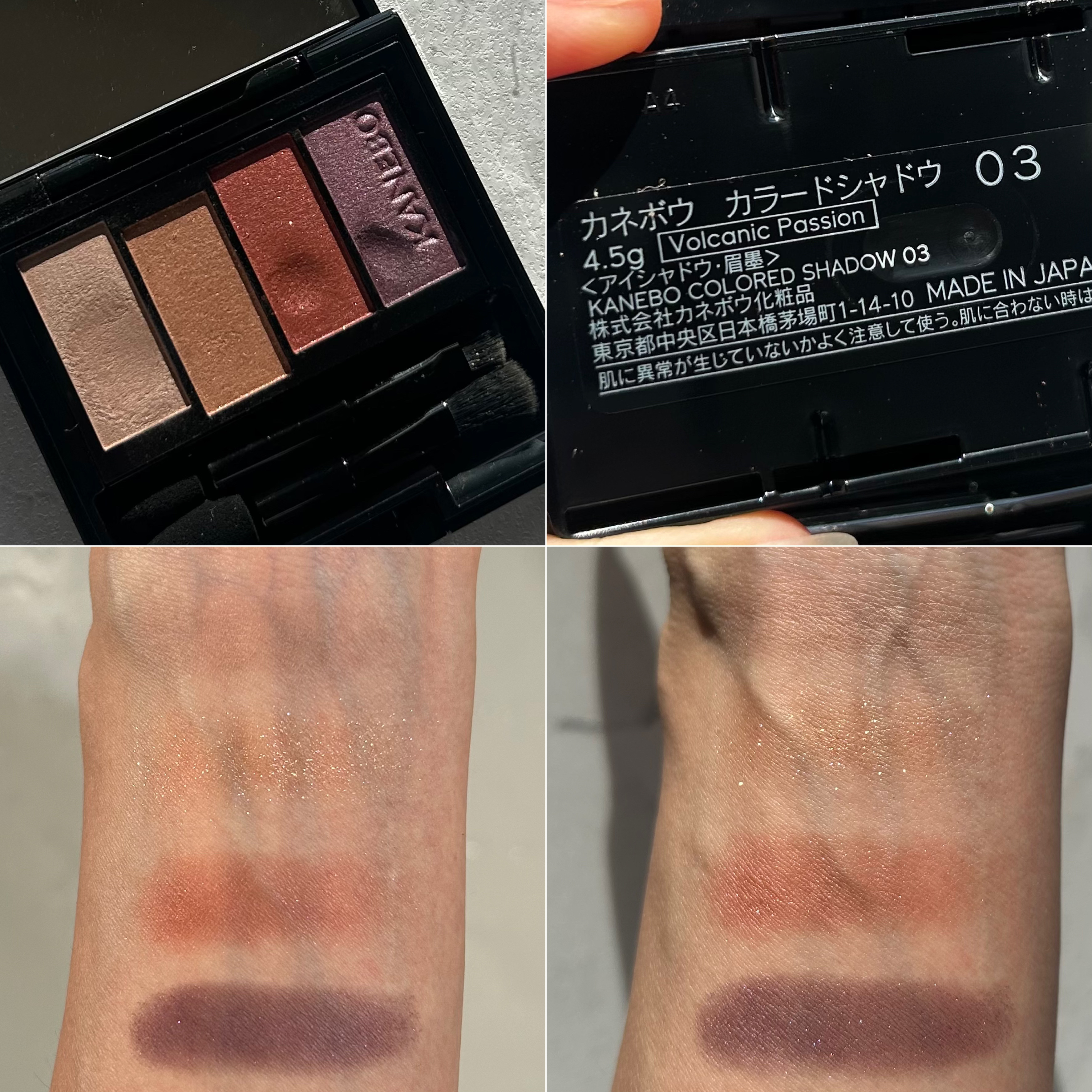 ブルベも使いやすいピーチカラーのパレット!左から薄い白みパープル、黄みのある偏光ラメ入りピーチピンク、明るいオレンジ、発色の良いパープルブラウン 肌に透けるように溶け込む粉質♡ 美しいです♡ 春らしい多幸感と透明感ある艶めきがさすがKANEBO!