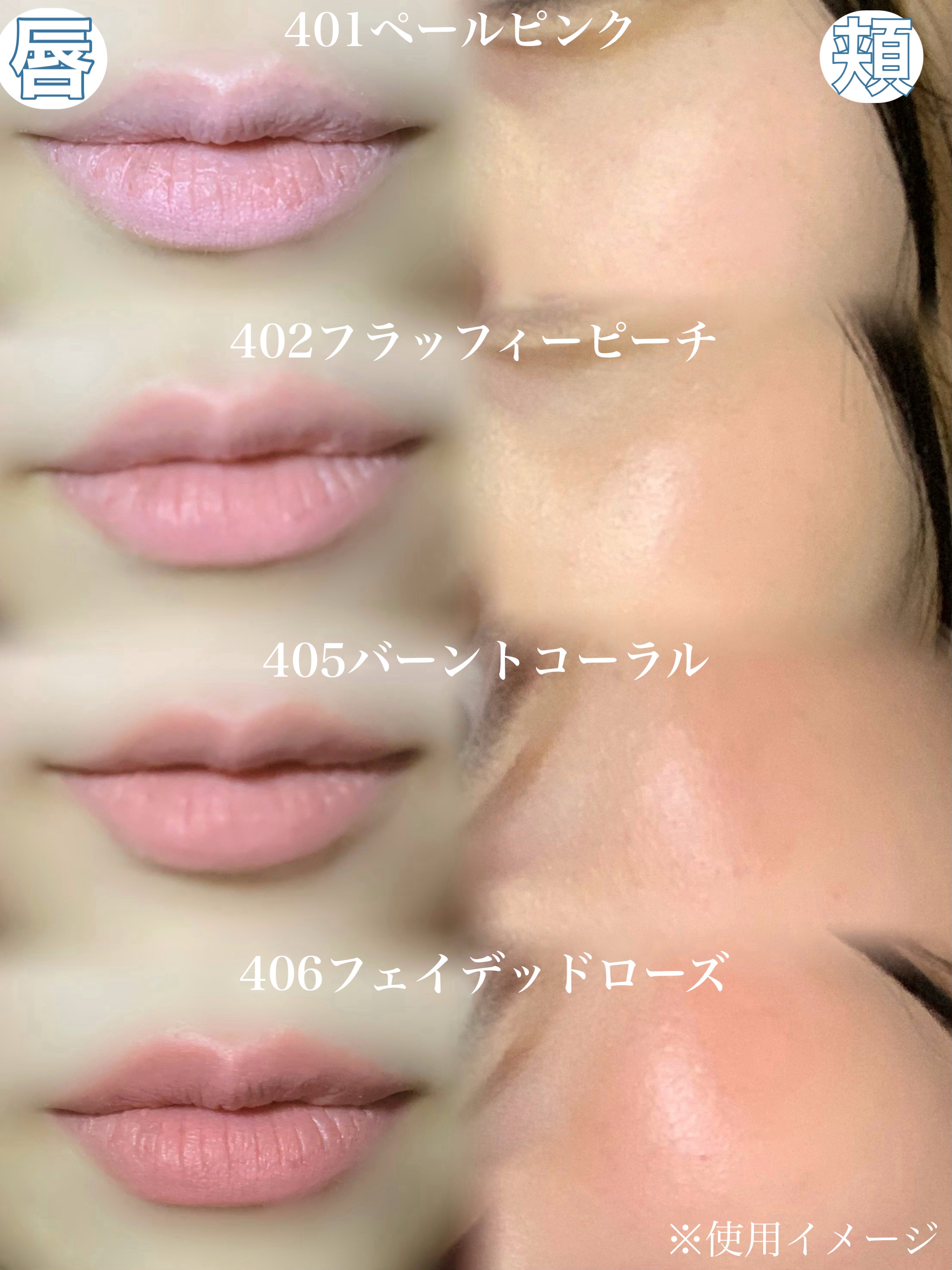 - <401 ペールピンク> ジメチコン、イソアミルラウレート、イソノニルイソノナン酸、ジイソステアリルマレート、酸化チタン(CI 77891)、イソエイコサン、ジメチコン/メチコン/シルセスキオキサン クロスポリマー、水添ポリイソブテン、合成ワックス、ジフェニルジメチコン/ビニルジフェニルジメチコン/シルセスキオキサン クロスポリマー、ポリエチレン、シリカ、ジメチコン/ビニルジメチコン クロスポリマー、エチルヘキシルヒドロキシステアレート、カプリル酸/カプリン酸トリグリセリド、カルナウバロウ、ルリジサ種子油、マンゴー種子脂、コメ胚芽油、ソルビタンイソステアレート、ジグリセリルセバケート/イソパルミテート、キャンデリラロウエステル、ポリグリセリル-2 トリイソステアレート、ステアラルコニウムヘクトライト、トリエトキシカプリリルシラン、プロピレンカーボネート、ポリグリセリル-2 ジイソステアレート、トコフェロール、香料、黄5湖(CI 19140)、赤28湖(CI 45410)、赤7湖(CI 15850)、酸化鉄(CI 77491) <402 フラッフィーピーチ> ジメチコン、イソアミルラウレート、イソノニルイソノナン酸、ジイソステアリルマレート、酸化チタン(CI 77891)、イソエイコサン、ジメチコン/メチコン/シルセスキオキサン クロスポリマー、水添ポリイソブテン、合成ワックス、ジフェニルジメチコン/ビニルジフェニルジメチコン/シルセスキオキサン クロスポリマー、ポリエチレン、シリカ、ジメチコン/ビニルジメチコン クロスポリマー、エチルヘキシルヒドロキシステアレート、カプリル酸/カプリン酸トリグリセリド、ポリグリセリル-2 トリイソステアレート、カルナウバロウ、ルリジサ種子油、マンゴー種子脂、コメ胚芽油、ソルビタンイソステアレート、ジグリセリルセバケート/イソパルミテート、キャンデリラロウエステル、ステアラルコニウムヘクトライト、トリエトキシカプリリルシラン、プロピレンカーボネート、ポリグリセリル-2 ジイソステアレート、トコフェロール、香料、酸化鉄(CI 77492)、酸化鉄(CI 77491)、黄5湖(CI 19140)、赤7湖(CI 15850) <403 テンダーピンク> ジメチコン、イソアミルラウレート、イソノニルイソノナン酸、ジイソステアリルマレート、酸化チタン(CI 77891)、イソエイコサン、ジメチコン/メチコン/シルセスキオキサン クロスポリマー、水添ポリイソブテン、合成ワックス、ジフェニルジメチコン/ビニルジフェニルジメチコン/シルセスキオキサン クロスポリマー、ポリエチレン、シリカ、ジメチコン/ビニルジメチコン クロスポリマー、エチルヘキシルヒドロキシステアレート、カプリル酸/カプリン酸トリグリセリド、ポリグリセリル-2 トリイソステアレート、カルナウバロウ、ルリジサ種子油、マンゴー種子脂、コメ胚芽油、ソルビタンイソステアレート、ジグリセリルセバケート/イソパルミテート、キャンデリラロウエステル、ステアラルコニウムヘクトライト、トリエトキシカプリリルシラン、ポリグリセリル-2 ジイソステアレート、プロピレンカーボネート、トコフェロール、香料、酸化鉄(CI 77492)、黄5湖(CI 19140)、赤7湖(CI 15850)、赤6(CI 15850) <404 ミスティピンク> ジメチコン、イソアミルラウレート、イソノニルイソノナン酸、ジイソステアリルマレート、酸化チタン(CI 77891)、イソエイコサン、ジメチコン/メチコン/シルセスキオキサン クロスポリマー、水添ポリイソブテン、合成ワックス、ジフェニルジメチコン/ビニルジフェニルジメチコン/シルセスキオキサン クロスポリマー、ポリエチレン、シリカ、ジメチコン/ビニルジメチコン クロスポリマー、カプリル酸/カプリン酸トリグリセリド、エチルヘキシルヒドロキシステアレート、カルナウバロウ、ルリジサ種子油、マンゴー種子脂、コメ胚芽油、ソルビタンイソステアレート、ジグリセリルセバケート/イソパルミテート、キャンデリラロウエステル、ポリグリセリル-2 トリイソステアレート、ポリグリセリル-2 ジイソステアレート、ステアラルコニウムヘクトライト、トリエトキシカプリリルシラン、プロピレンカーボネート、トコフェロール、香料、赤7湖(CI 15850)、酸化鉄(CI 77491)、黄6湖(CI 15985) <405 バーントコーラル> ジメチコン、イソアミルラウレート、イソノニルイソノナン酸、ジイソステアリルマレート、酸化チタン(CI 77891)、イソエイコサン、ジメチコン/メチコン/シルセスキオキサン クロスポリマー、水添ポリイソブテン、合成ワックス、ジフェニルジメチコン/ビニルジフェニルジメチコン/シルセスキオキサン クロスポリマー、ポリエチレン、シリカ、ジメチコン/ビニルジメチコン クロスポリマー、エチルヘキシルヒドロキシステアレート、ポリグリセリル-2 トリイソステアレート、カプリル酸/カプリン酸トリグリセリド、カルナウバロウ、ルリジサ種子油、マンゴー種子脂、コメ胚芽油、ソルビタンイソステアレート、ジグリセリルセバケート/イソパルミテート、キャンデリラロウエステル、ステアラルコニウム