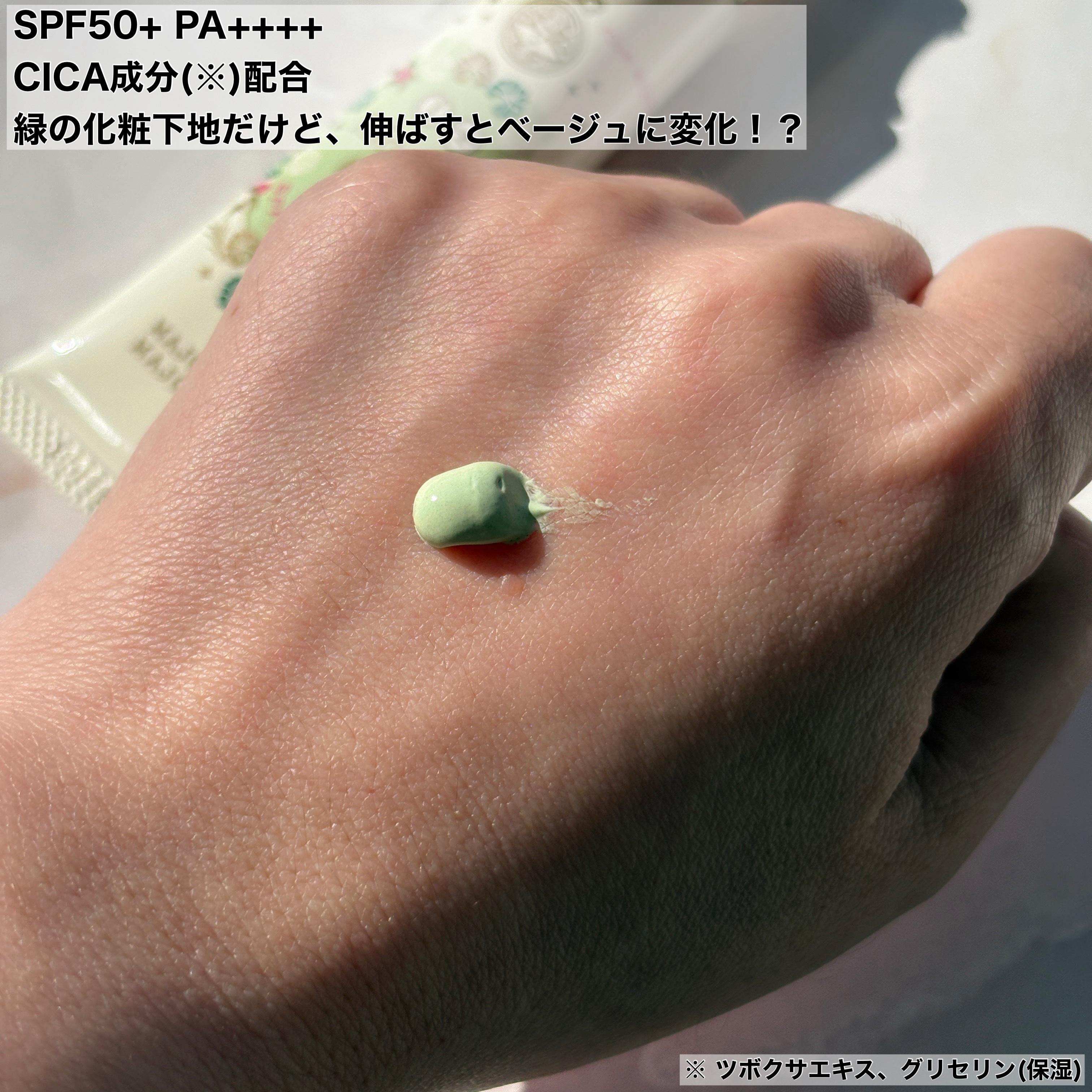 MAJOLICAMAJORCAのマジカルカラーベース🟢✍️グリーンからベージュにカラーが変わる面白い下地!✍️明るめのベージュに仕上がるので日焼けしてる方には合わないかも✍️マジョマジョのベース初めてやったけどワタシには合わなかった…✍️手に...
