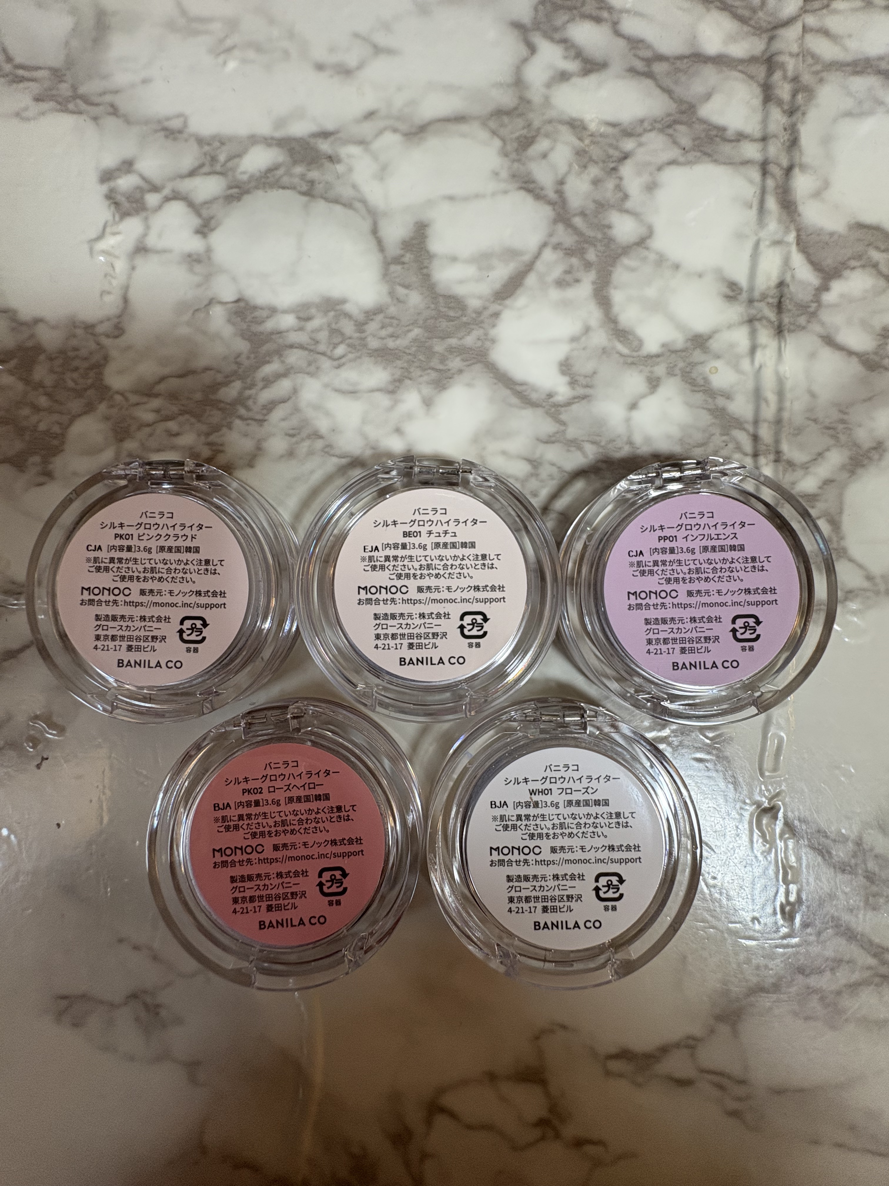 - <BE01 チュチュ> ジメチコン、酸化チタン、マイカ、合成フルオロフロゴパイト、(HDI/トリメチロールヘキシルラクトン)クロスポリマー、シリカ、ミリスチン酸Mg、グリセリン、ペンチレングリコール、ポリメチルシルセスキオキサン、ステアリン酸Mg、ポリソルベート20、(アクリル酸Na/アクリロイルジメチルタウリンNa)コポリマー、トリエトキシカプリリルシラン、ケイ酸(Al/Mg)、酸化鉄、オリーブ油脂肪酸ソルビタン、ステアリン酸ソルビタン、イソヘキサデカン、(ビニルジメチコン/メチコンシルセスキオキサン)クロスポリマー、酸化スズ、エチルヘキシルグリセリン、デヒドロ酢酸Na、ポリソルベート80、セテアリルアルコール、オレイン酸ソルビタン、トリイソステアリン酸イソプロピルチタン、トコフェロール <PK01 ピンククラウド> 合成フルオロフロゴパイト、酸化チタン、ジメチコン、(HDI/トリメチロールヘキシルラクトン)クロスポリマー、マイカ、シリカ、ミリスチン酸Mg、グリセリン、ペンチレングリコール、ポリメチルシルセスキオキサン、トリエトキシカプリリルシラン、ステアリン酸Mg、ポリソルベート20、(アクリル酸Na/アクリロイルジメチルタウリンNa)コポリマー、ケイ酸(Al/Mg)、酸化スズ、オリーブ油脂肪酸ソルビタン、ステアリン酸ソルビタン、イソヘキサデカン、(ビニルジメチコン/メチコンシルセスキオキサン)クロスポリマー、エチルヘキシルグリセリン、デヒドロ酢酸Na、ポリソルベート80、セテアリルアルコール、オレイン酸ソルビタン、トリイソステアリン酸イソプロピルチタン、トコフェロール <PK02 ローズヘイロー> ジメチコン、合成フルオロフロゴパイト、酸化チタン、マイカ、(HDI/トリメチロールヘキシルラクトン)クロスポリマー、シリカ、ミリスチン酸Mg、酸化鉄、グリセリン、ペンチレングリコール、ポリメチルシルセスキオキサン、ステアリン酸Mg、ポリソルベート20、(アクリル酸Na/アクリロイルジメチルタウリンNa)コポリマー、赤226、ケイ酸(Al/Mg)、トリエトキシカプリリルシラン、グンジョウ、オリーブ油脂肪酸ソルビタン、ステアリン酸ソルビタン、イソヘキサデカン、酸化スズ、(ビニルジメチコン/メチコンシルセスキオキサン)クロスポリマー、エチルヘキシルグリセリン、デヒドロ酢酸Na、ポリソルベート80、セテアリルアルコール、オレイン酸ソルビタン、トリイソステアリン酸イソプロピルチタン、トコフェロール <PP01 インフルエンス> ジメチコン、酸化チタン、合成フルオロフロゴパイト、マイカ、(HDI/トリメチロールヘキシルラクトン)クロスポリマー、シリカ、ミリスチン酸Mg、グリセリン、ペンチレングリコール、ポリメチルシルセスキオキサン、グンジョウ、トリエトキシカプリリルシラン、ステアリン酸Mg、ポリソルベート20、(アクリル酸Na/アクリロイルジメチルタウリンNa)コポリマー、ケイ酸(Al/Mg)、オリーブ油脂肪酸ソルビタン、ステアリン酸ソルビタン、イソヘキサデカン、(ビニルジメチコン/メチコンシルセスキオキサン)クロスポリマー、エチルヘキシルグリセリン、デヒドロ酢酸Na、赤226、酸化鉄、酸化スズ、ポリソルベート80、セテアリルアルコール、オレイン酸ソルビタン、トリイソステアリン酸イソプロピルチタン、トコフェロール <WH01 フローズン> マイカ、ジメチコン、酸化チタン、合成フルオロフロゴパイト、ホウケイ酸(Ca/チタン)、(HDI/トリメチロールヘキシルラクトン)クロスポリマー、シリカ、ミリスチン酸Mg、グリセリン、ペンチレングリコール、ポリメチルシルセスキオキサン、ステアリン酸Mg、ポリソルベート20、(アクリル酸Na/アクリロイルジメチルタウリンNa)コポリマー、ケイ酸(Al/Mg)、トリエトキシカプリリルシラン、オリーブ油脂肪酸ソルビタン、ステアリン酸ソルビタン、イソヘキサデカン、(ビニルジメチコン/メチコンシルセスキオキサン)クロスポリマー、エチルヘキシルグリセリン、デヒドロ酢酸Na、酸化スズ、ポリソルベート80、セテアリルアルコール、オレイン酸ソルビタン、トリイソステアリン酸イソプロピルチタン、トコフェロール