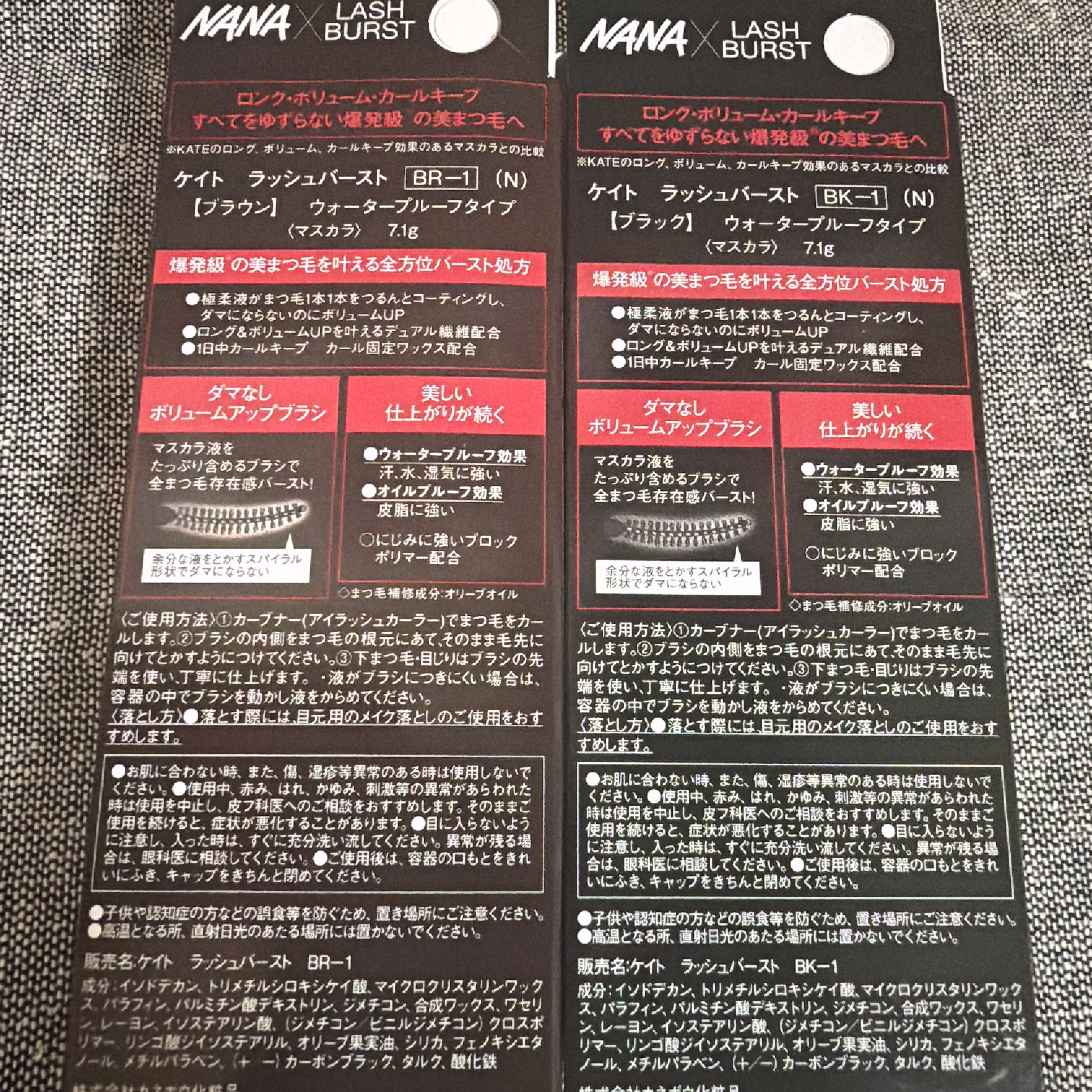 - ロング・ボリューム・カールキープ、全てをゆずらない。 ダマになりにくい爆発級*1に美しいまつ毛へ。 ◆汗・水・湿気に強いウォータープルーフ ◆皮脂に強いオイルプルーフ ◆まつ毛補修成分配合(オリーブオイル) ■ロング&ボリュームUPを叶えるデュアル繊維配合 ■長時間カールキープ カール固定ワックス配合 ダマになりにくいボリュームアップブラシ ■マスカラ液をたっぷり含めるブラシ ■にじみに強いブロックポリマー配合 ■ラッシュマキシマイザーHP2.0 ロングもボリュームもまつ毛全方位盛り 長時間カール持続マスカラ下地 ■カール固定ワックス高配合*2 ■黒い繊維入りの白半透明カラー <ラッシュバースト限定セットⅠ BK-1> ラッシュバーストに、ミニサイズのカール持続マスカラ下地がついた限定セット セット内容: ケイト ラッシュバースト BK-1 7.1g(マスカラ) ケイト ラッシュマキシマイザーHP 2.0 EX-1 4.2g(まつ毛用化粧下地) <ケイト ラッシュバースト限定セットⅡ BR-1/BR-2> ラッシュバーストに自眉の黒をやわらげてふんわり仕上がる脱色級*3 眉マスカラ3DアイブロウカラーZミニサイズがついた限定セット ■ BR-1【ナチュラルブラウン】 BR-2【ライトブラウン】 セット内容: ケイト ラッシュバースト BK-1(マスカラ) 7.1g ケイト 3DアイブロウカラーZ BR-1(眉墨) 3.0g <BK-1(N) ブラック(限定)・BR-1(N) ブラウン(限定)> NANAコラボレーションの限定デザイン *1KATEのロング、ボリューム、カールキープ効果のあるマスカラとの比較 *2ケイト ラッシュマキシマイザーシリーズとして *3脱色したような色合い