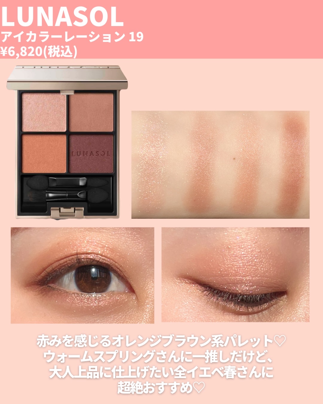 ルナソルのピンクはラメ感控えめなのでオフィスメイクにおすすめ🙆🏻♀️✨ CHANELはかなり万能だと思っていて、柔らかく仕上げればイエベ春の私ももちろんハマるし✨ ブランドごとにもちろん特徴がありますし、ピンクといってもパレットによって仕上がりはさまざま!