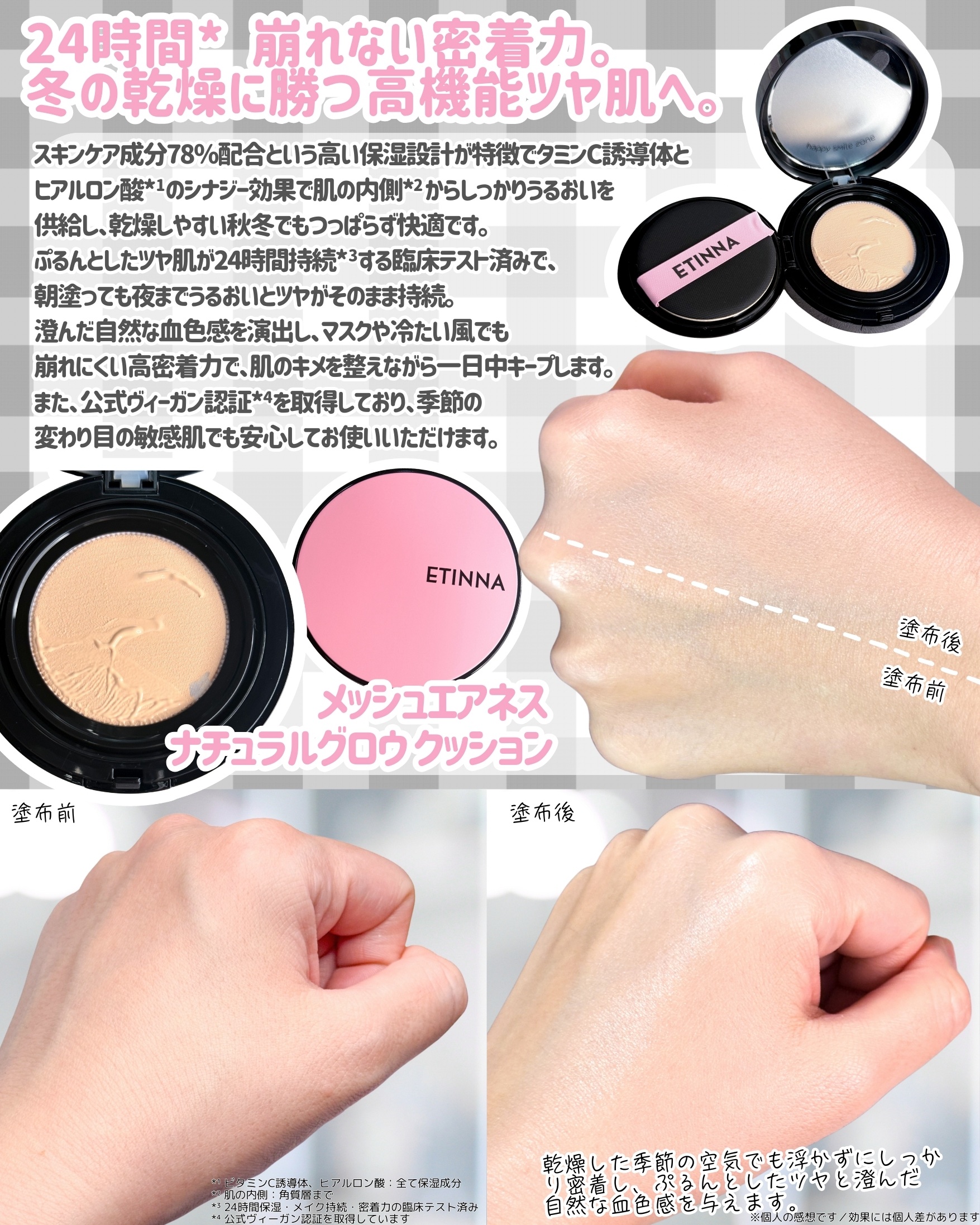 ETINNAMeshAirnessNaturalGlowCushion@etinna.official@etinna_jp秋冬の肌にぴったりなツヤ+高密着+保湿クッション💖季節の変わり目でも浮かずに、しっとりとうるおうから、乾燥が気になる秋冬...