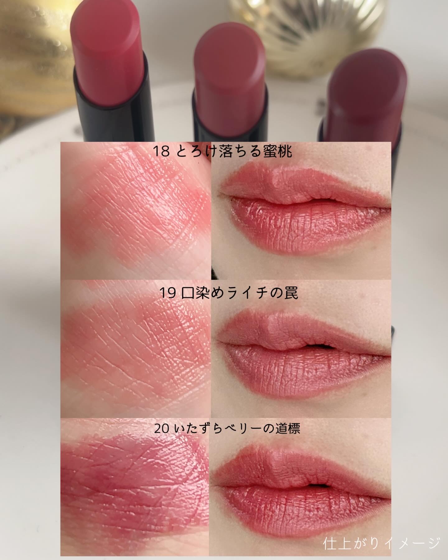 今回のリプモン新作は#モンスター果樹園・リップモンスター 18 とろけ落ちる蜜桃 ・リップモンスター 19 口染めライチの甘い罠 ・リップモンスター 20 いたずらベリーの道標落ちにくいリップモンスターから甘い果実のようなニュアンスピンク系の...