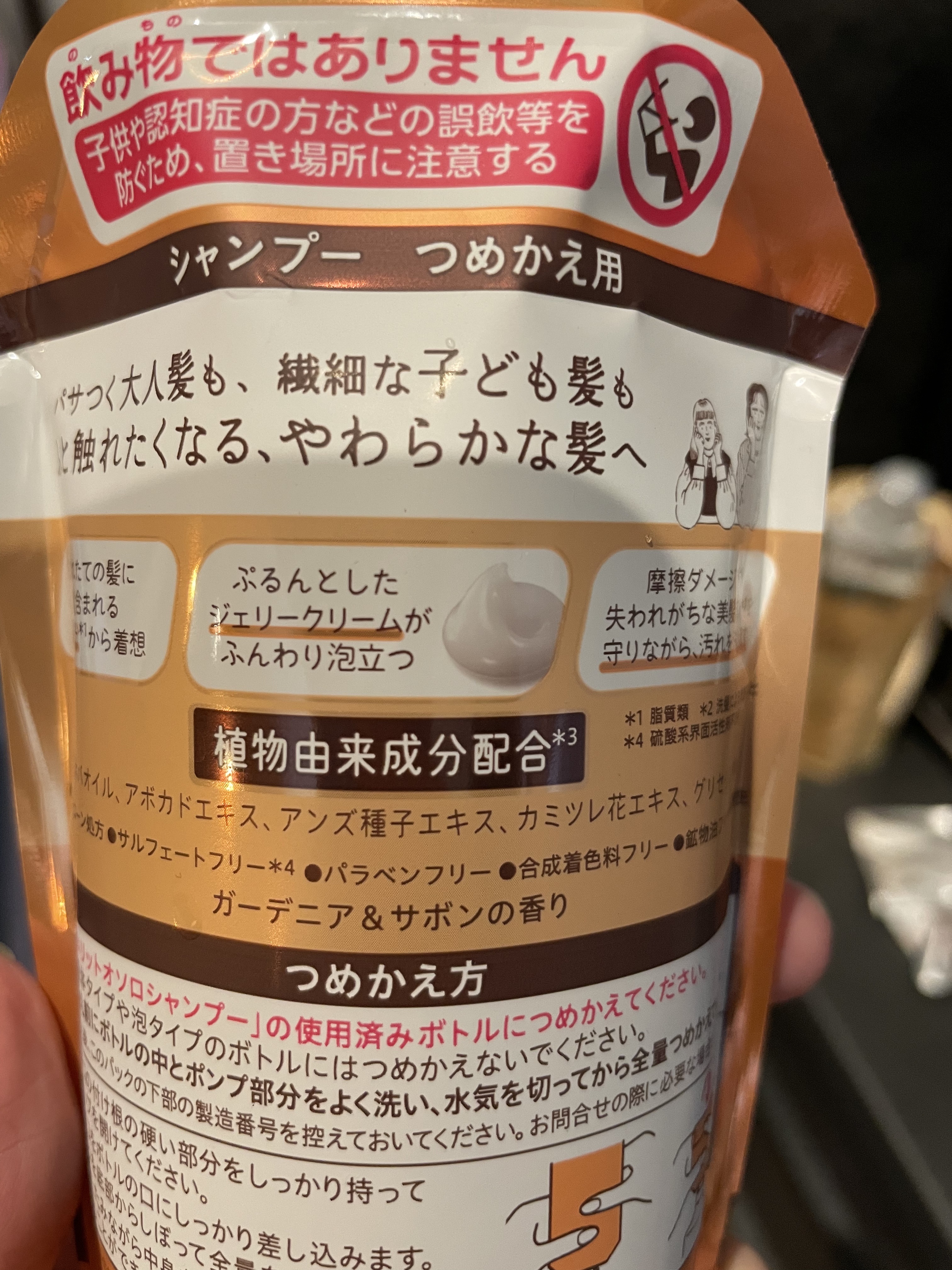 - 〈シャンプー〉 パサつく大人髪も、繊細な子ども髪も。ふと触れたくなる、やわらかな髪へ。 ぷるんとしたジェリークリーム。 摩擦ダメージ*6から髪を守りながら、やさしい泡で汚れを洗い流す。 ● 植物由来成分配合*4 ● 自然由来指数90%(水を含む) ISO16128準拠 ● サルフェートフリー*5/パラベンフリー/合成着色料フリー/鉱物油フリー/弱酸性 ● ノンシリコーン処方 ● 何でもない日に気分ときめく ガーデニア&サボンの香り *4 ホホバオイル、アボカドエキス、アンズ種子エキス、カミツレ花エキス、グリセリン(保湿) *5 硫酸系界面活性剤不使用 *6 洗髪による摩擦のこと 〈コンディショナー〉 パサつく大人髪も、繊細な子ども髪も。ふと触れたくなる、やわらかな髪へ。 Osoloリペア処方採用。リペア美髪成分*2が髪の内側に浸透。 シルキー美髪成分*3が髪の表面をコート。毛先までみずみずしくまとまる。 ● 植物由来成分配合*4 ● 自然由来指数90%(水を含む) ISO16128準拠 ● サルフェートフリー*5/パラベンフリー/合成着色料フリー/鉱物油フリー/弱酸性 ● 何でもない日に気分ときめく ガーデニア&サボンの香り *2 ヒマワリ種子油(補修) *3 ラノリン脂肪酸(補修) *4 ホホバオイル、アボカドエキス、アンズ種子エキス、カミツレ花エキス、グリセリン(保湿) *5 硫酸系界面活性剤不使用