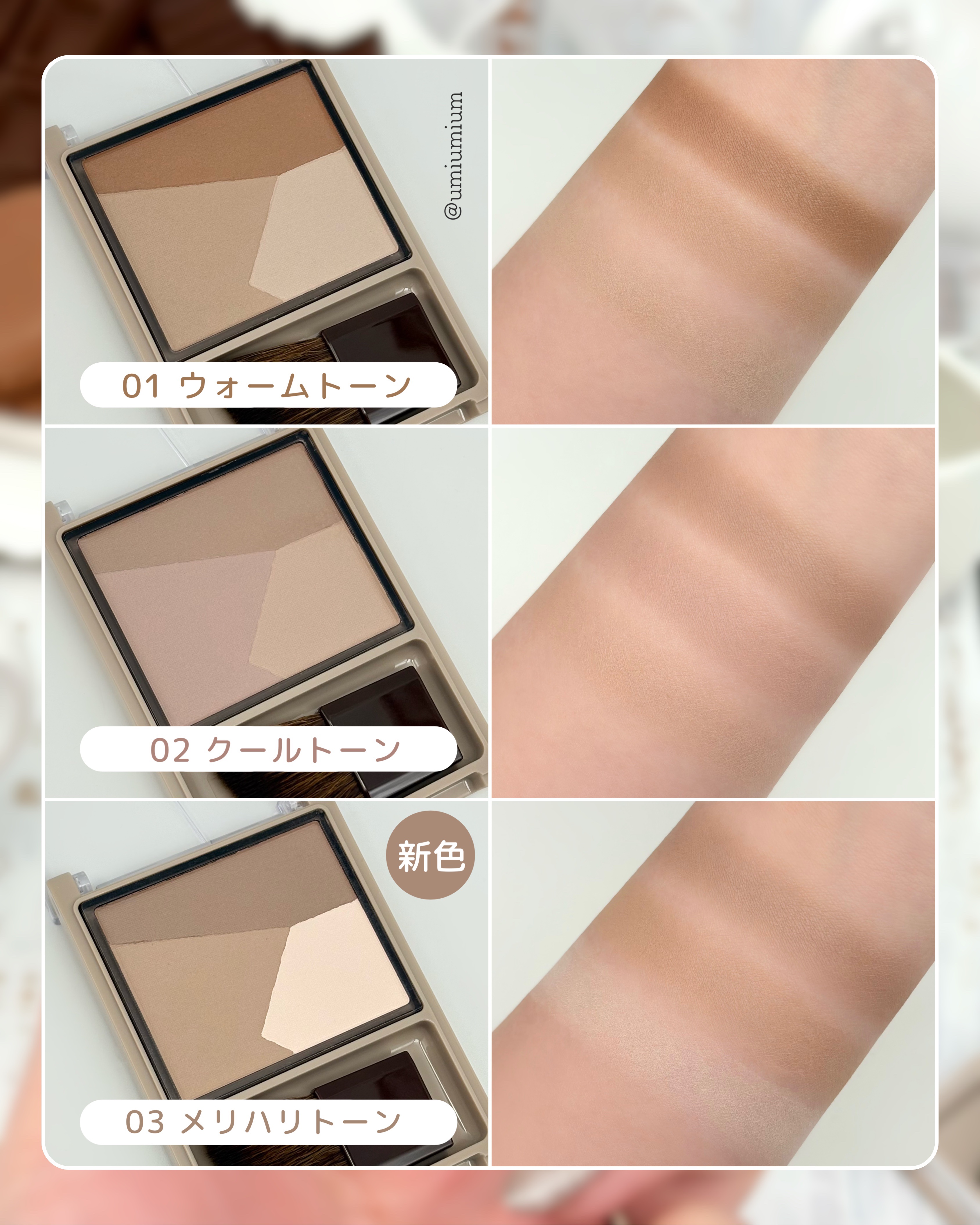 - 自然な陰影をプラスする3色グラデーションシェーディング。入れたい部分に合わせて濃淡・色味をぴったり調節できます。混ぜても一色ずつでも、使い方自由自在。 美容保湿成分(オリーブ果実油、バオバブ種子油、ヒアルロン酸Na)配合。 鼻筋にフィットする斜めカットブラシ付。 01 ウォームトーン:グレーが混ざったベージュ~ブラウンパレット。イエローベースの方、自然な陰影感が欲しい方に。肌色問わず使いやすい。迷ったらこれ。 02 クールトーン:グレーが混ざったベージュ~モーヴブラウンパレット。ブルーベースの方、より陰影感が欲しい方におすすめ。 03 メリハリトーン:マットなホワイトとグレーブラウンの組み合わせでメリハリ立体感を演出。肌色問わず使いやすい。 (ご使用方法) ブラシに適量を取り、輪郭や鼻筋の横など影を入れたい部分に塗布してください。単色はもちろん、お好きな色を混ぜてもお使いいただけます。 (使用上の注意) お肌に異常が生じていないかよく注意して使用してください。お肌に合わない時は、ご使用をおやめください。