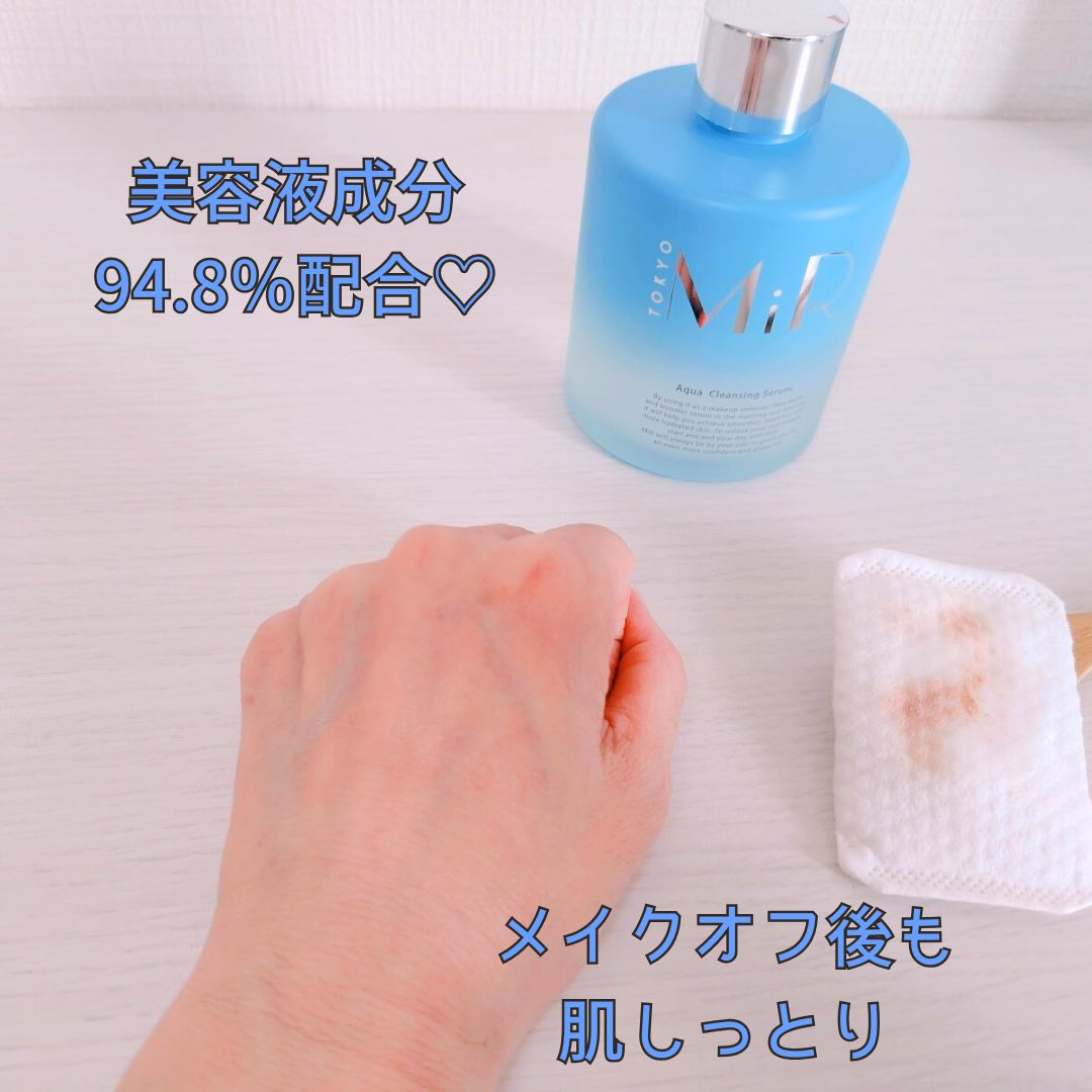 MiRアクアクレンジングセラムメイク落とし&洗顔&導入液としても使えるふき取りクレンジングクレンジング後もうるおいを守れるようにと、美容成分94.8%入ってるんだって!コットンに出すととろーりのびるぐらいのとろみテクスチャーが...