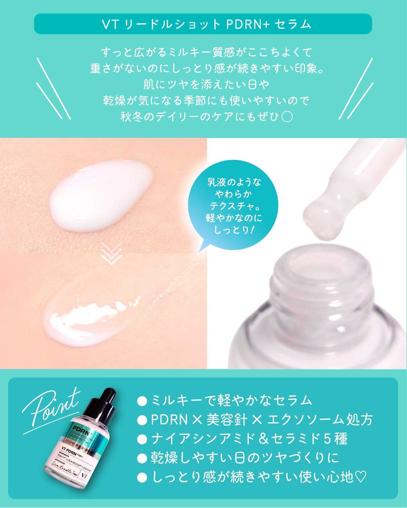 - ハリのない肌コンディションを整える スペシャルPDRN+™×美容針×エクソソーム(全て整肌)配合でハリケア 水分感のあるもちっとミルキーセラムがピタッとなじみ、肌にツヤ感を与える。 さらにツヤ美容成分をプラス! ・ナイアシンアミド: ツヤ肌ケア、保湿 ・セラミド : 肌バリアサポート、乾燥・肌荒れ防止 洗顔後、適量を取り、肌のキメに沿ってやさしくなじませます。