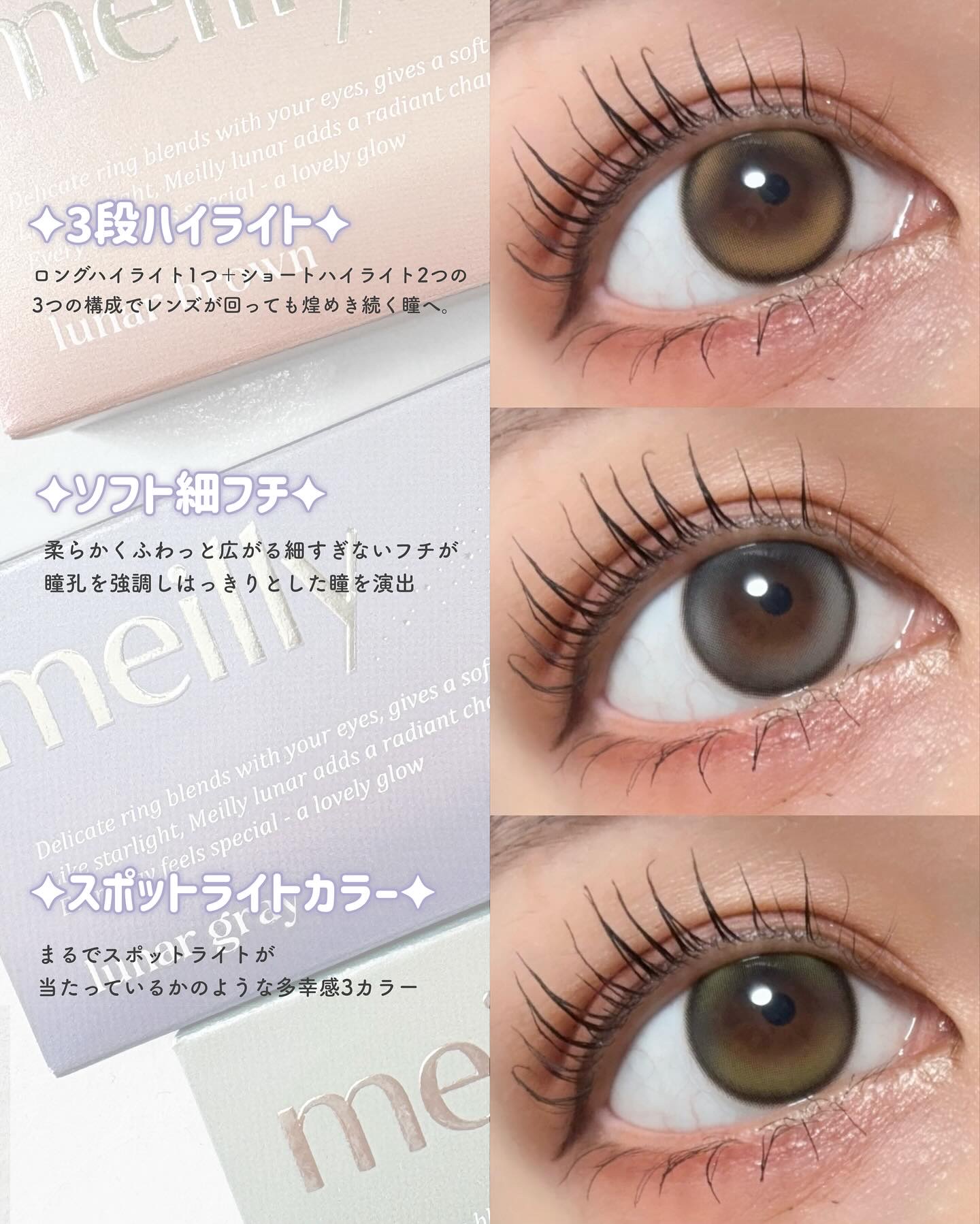 ▼3段ハイライトの多幸感レンズ誕生🩷【meilly/lunarシリーズ】meilly(メイリー)lunarシリーズ全3色/各1,760円(税込)【カラー】#ルーナーブラウン#ルーナーグレー#ルーナーオリーブ《レンズスペック》使用期間:...