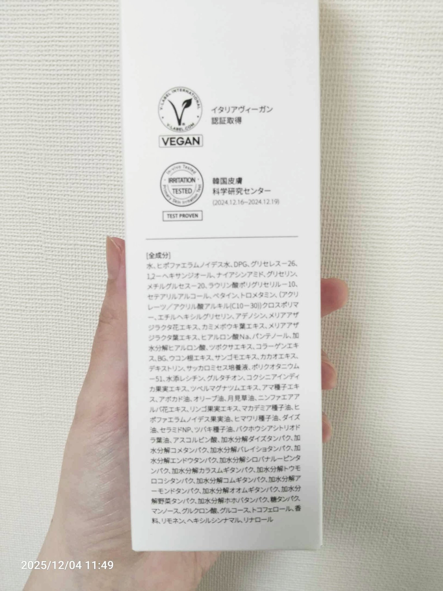 - 吸収の早いセラムウォーターテクスチャーでしっとり爽やかヴィーガンセラムトナー みずみずしさ弾ける水分感で保湿はしっかり、 仕上がりはさっぱり。 ヴィーガン認証完了で安心して使用して頂けます。 イタリアヴィーガン認証V-LABEL取得しました。 皮膚低刺激テスト済み* *全ての方に皮膚刺激が発生しないということではありません。 【ご使用方法】 1. デイリーケアとしての使用法 適量を手に取り肌にまんべんなく塗ります。 2.ふき取りケアとしての使用法 コットンに適量を含ませ肌のキメに合わせ撫でるように優しく吸収させます。 【使用上の注意】 本製品には小麦由来成分が含まれています、使用中に異常があった場合は使用を控え下さい。 お肌に異常が生じていないかよく注意して使用してください。 化粧品がお肌に合わないとき即ち次のような場合には、使用を中止してください。 そのまま化粧品類の使用を続けますと、症状を悪化させることがありますので、皮膚科専門医等にご相談されることをおすすめします。 (1)使用中、赤味、はれ、かゆみ、刺激、色抜け(白斑等)や黒ずみ等の異常があらわれた場合 (2)使用したお肌に、直接日光があたって上記のような異常があらわれた場合 傷やはれもの、しっしん等、異常のある部位にはお使いにならないでください。